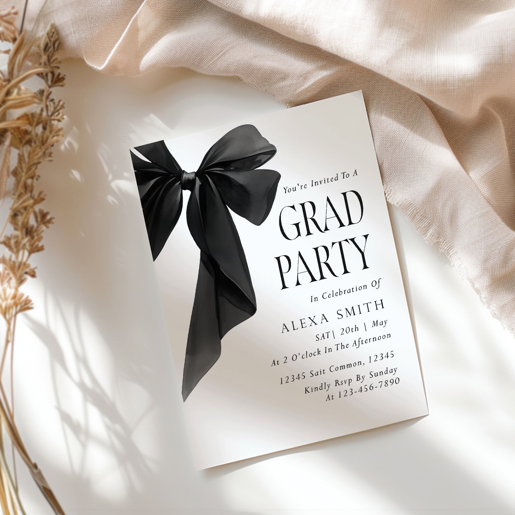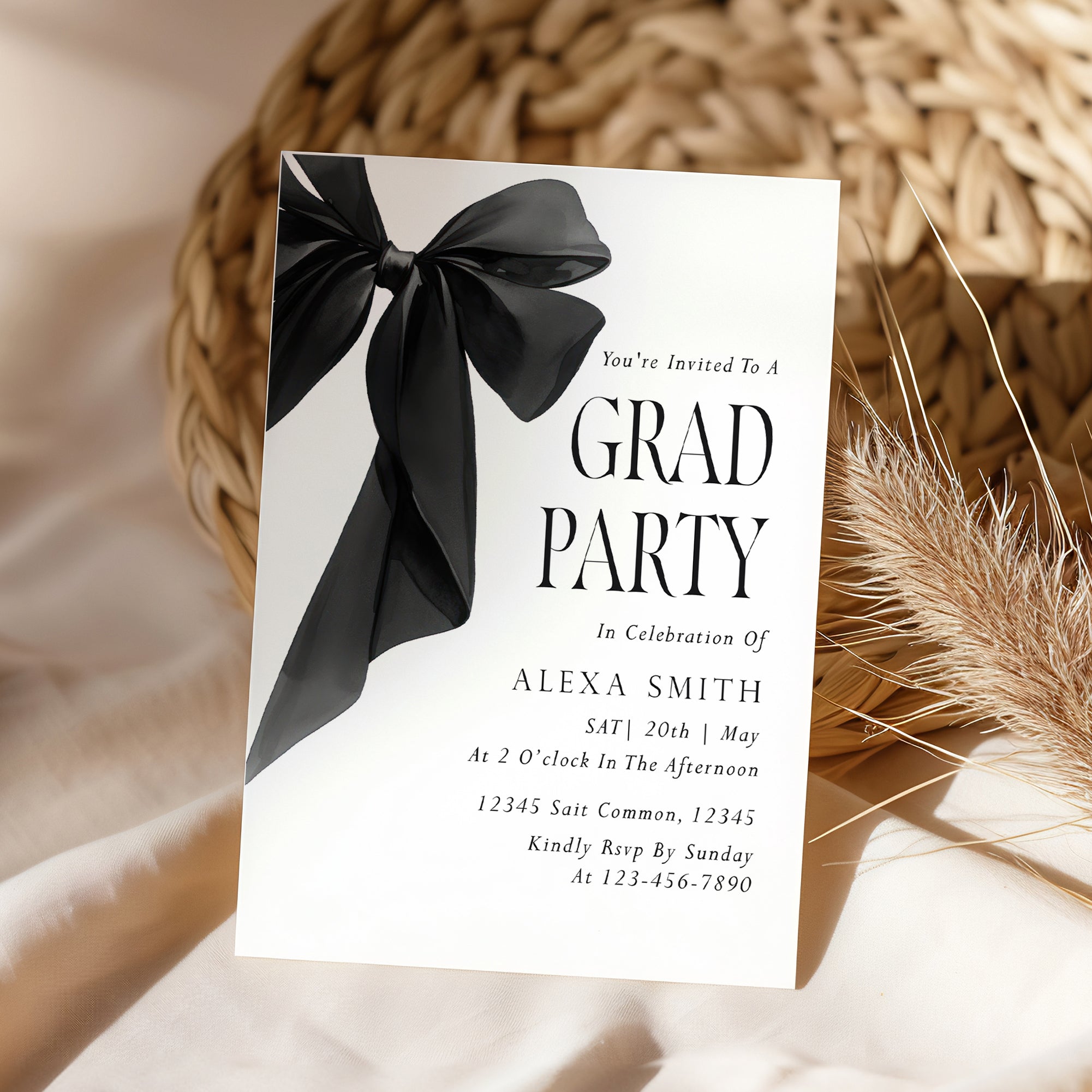 Black Bow Graduation Party Invite Coquette Preppy Girl Chic Editable Template 0808