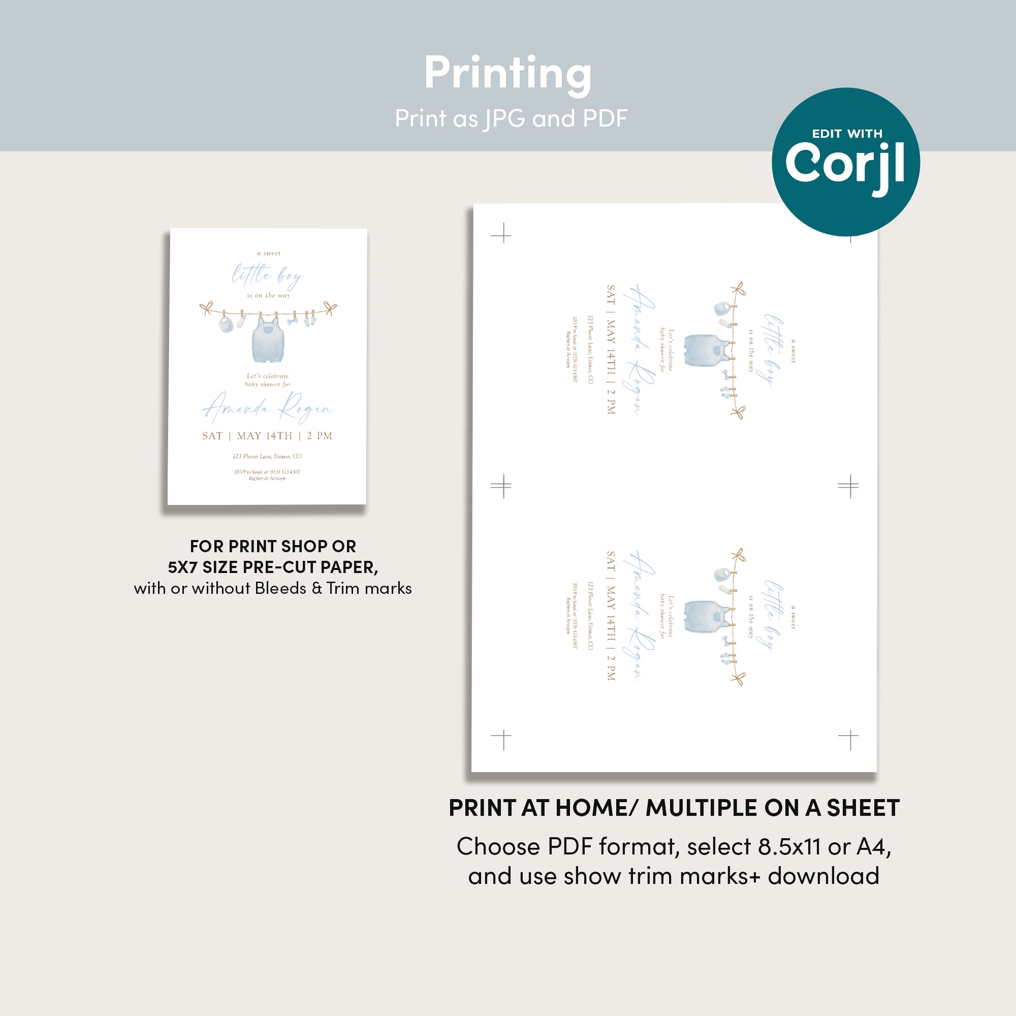 | Instructions | 1. After purchasing, check your email for a link to access your template (sent to your account email). If you can’t find it, log in at corjl.com with your order transaction number. 2. Make changes to the template and save. 3. Download your file in PDF or JPG format. Options include adding a bleed and saving paper. 4. Print on heavy matte white cardstock. You can print at home or use a professional print shop. |