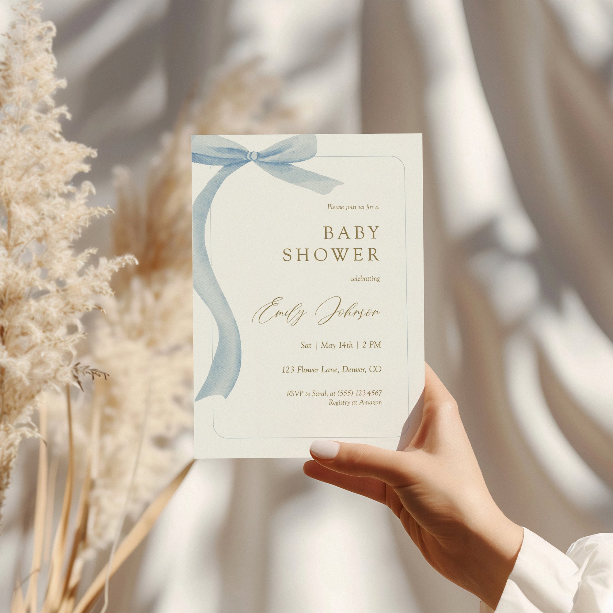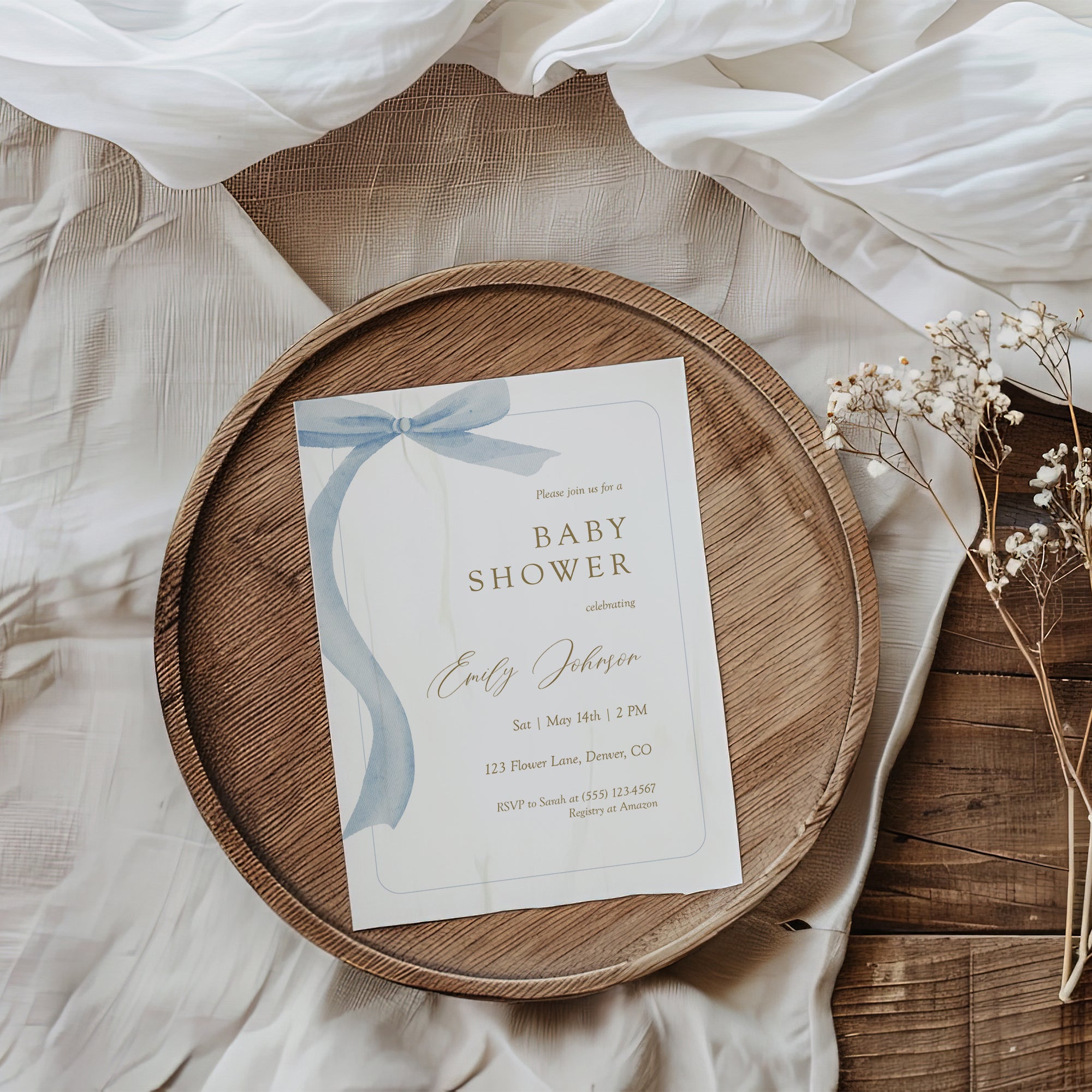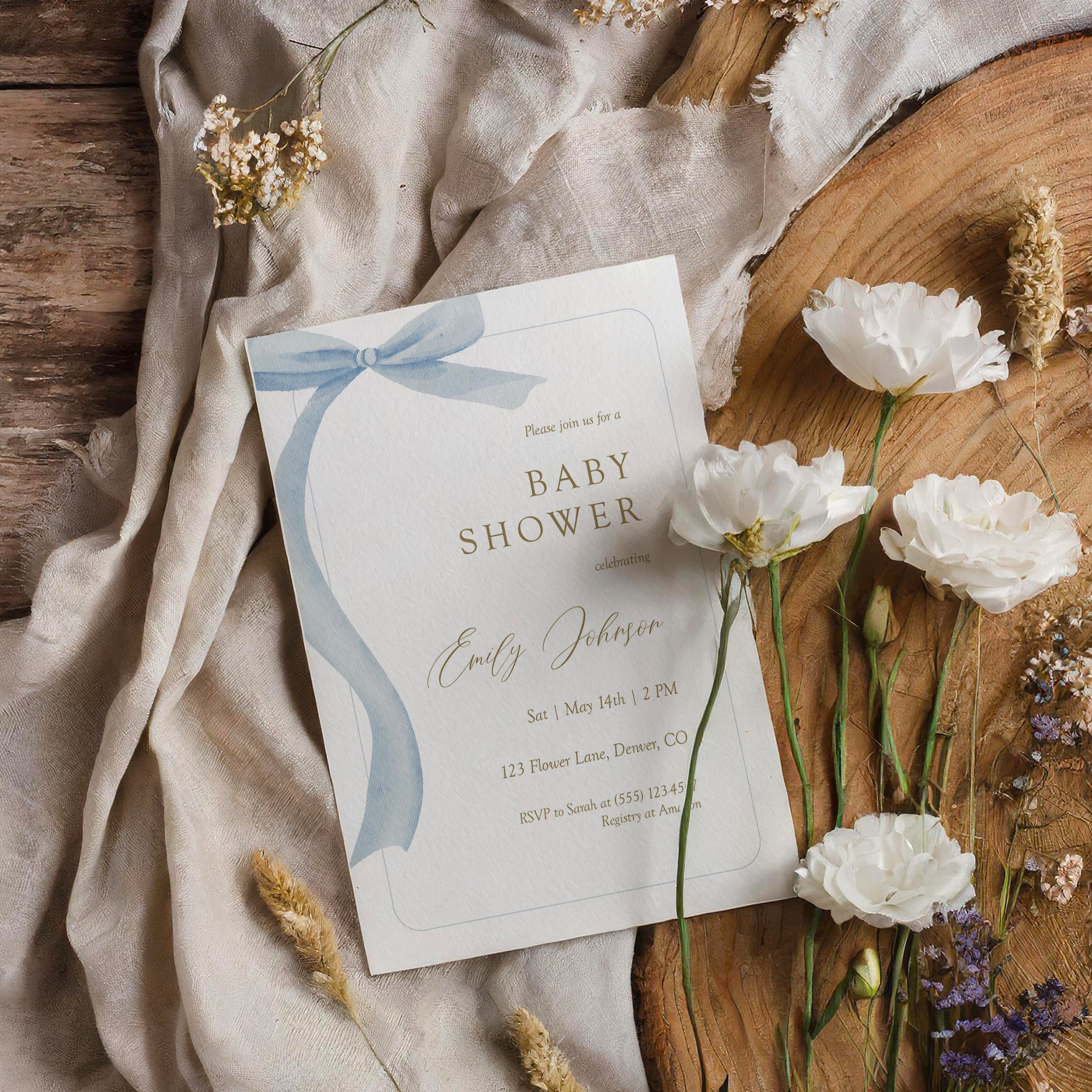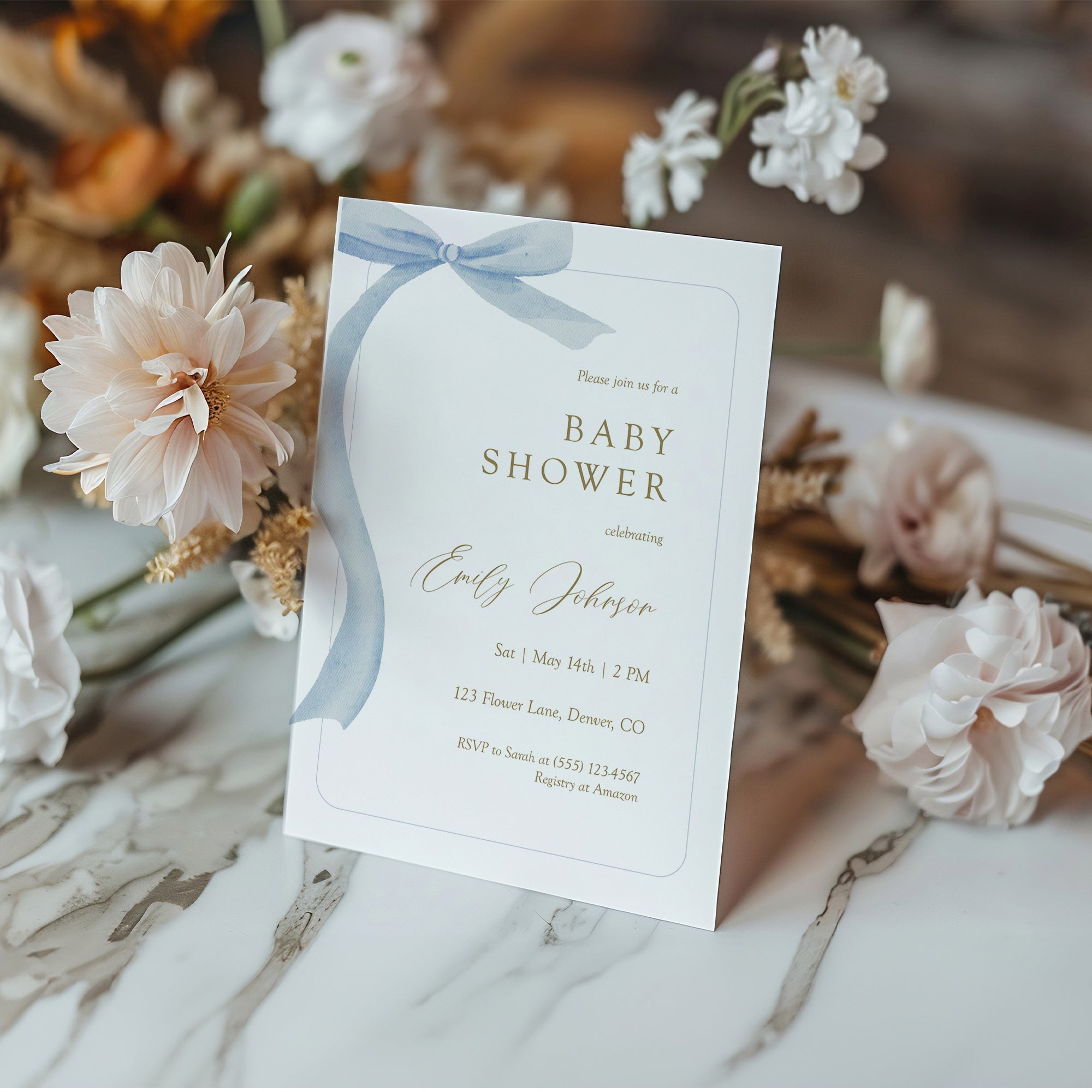 Introducing our charming blue bow baby shower invitation, perfect for celebrating your little one's arrival! This invitation features a delightful watercolor coquette bow ribbon, adding a touch of elegance to your celebration. With its minimal classic design, it’s ideal for modern parents seeking a stylish yet understated announcement. Customize your details easily for a personal touch. Make your baby shower unforgettable with this beautiful invitation that reflects the joy of welcoming your new bundle of joy!