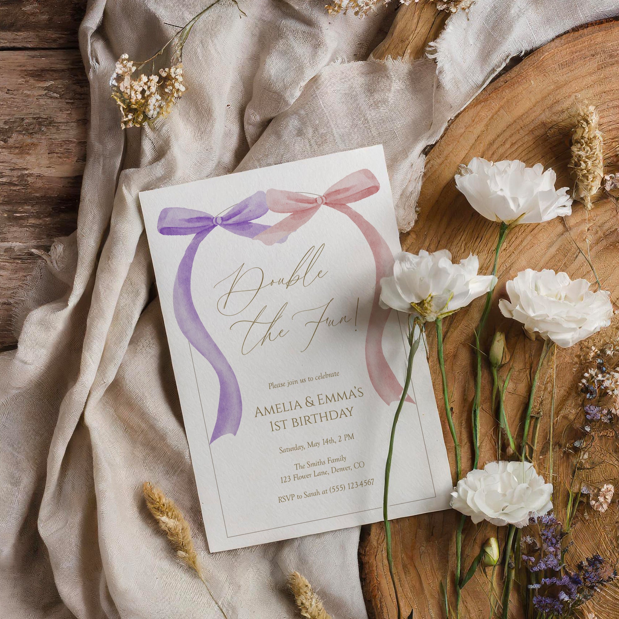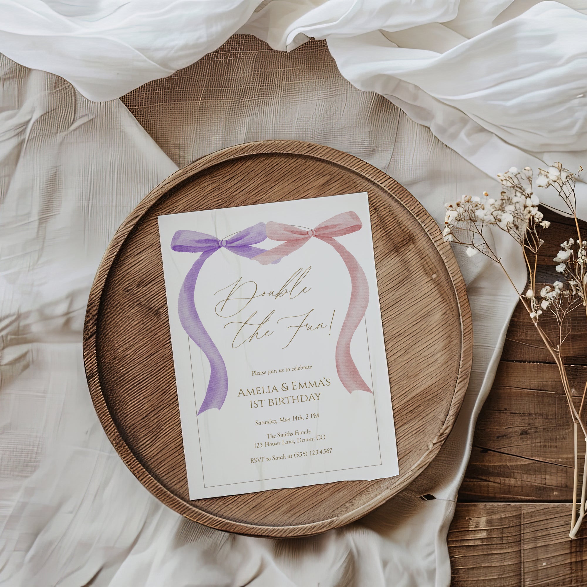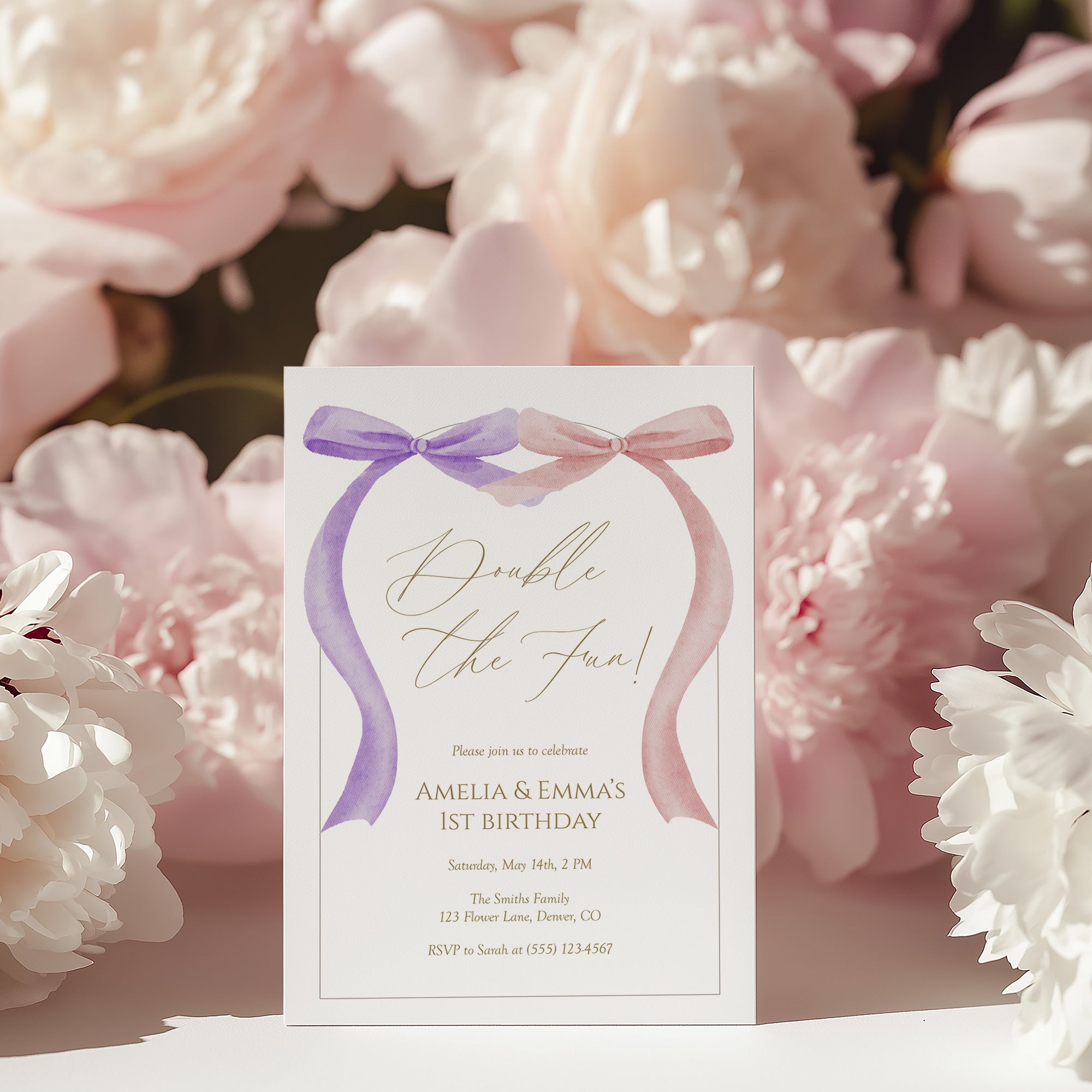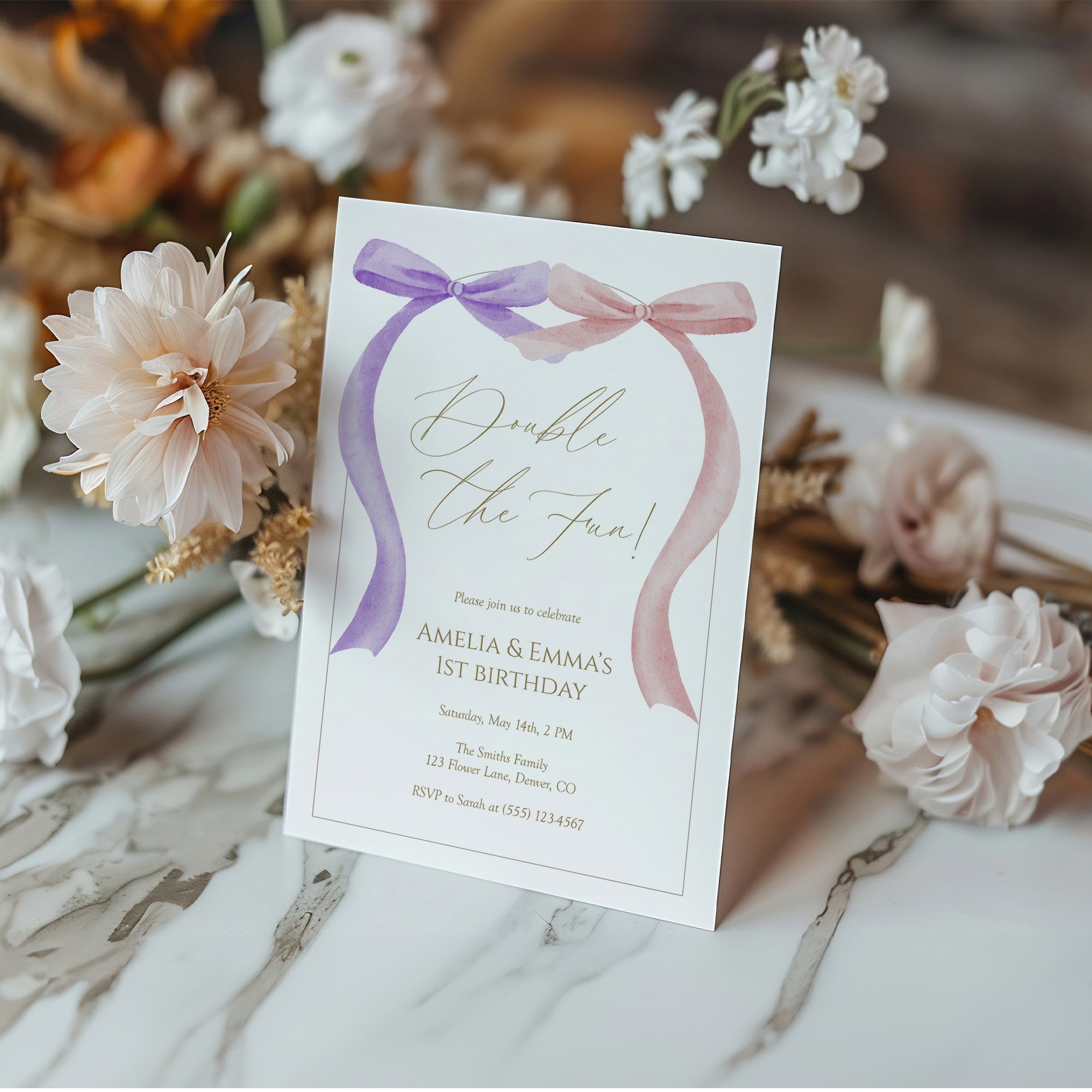 Celebrate in style with our Double the Fun Invitation, perfect for twin sisters' birthday parties! This enchanting design features beautiful pink and purple bows, adorned with elegant watercolor ribbons in pastel shades. With our editable template, you can personalize your invite effortlessly for that special celebration. Download your digital file instantly and get ready to spread the joy! Make unforgettable memories with a charming invitation that captures the spirit of your little ones' special day!