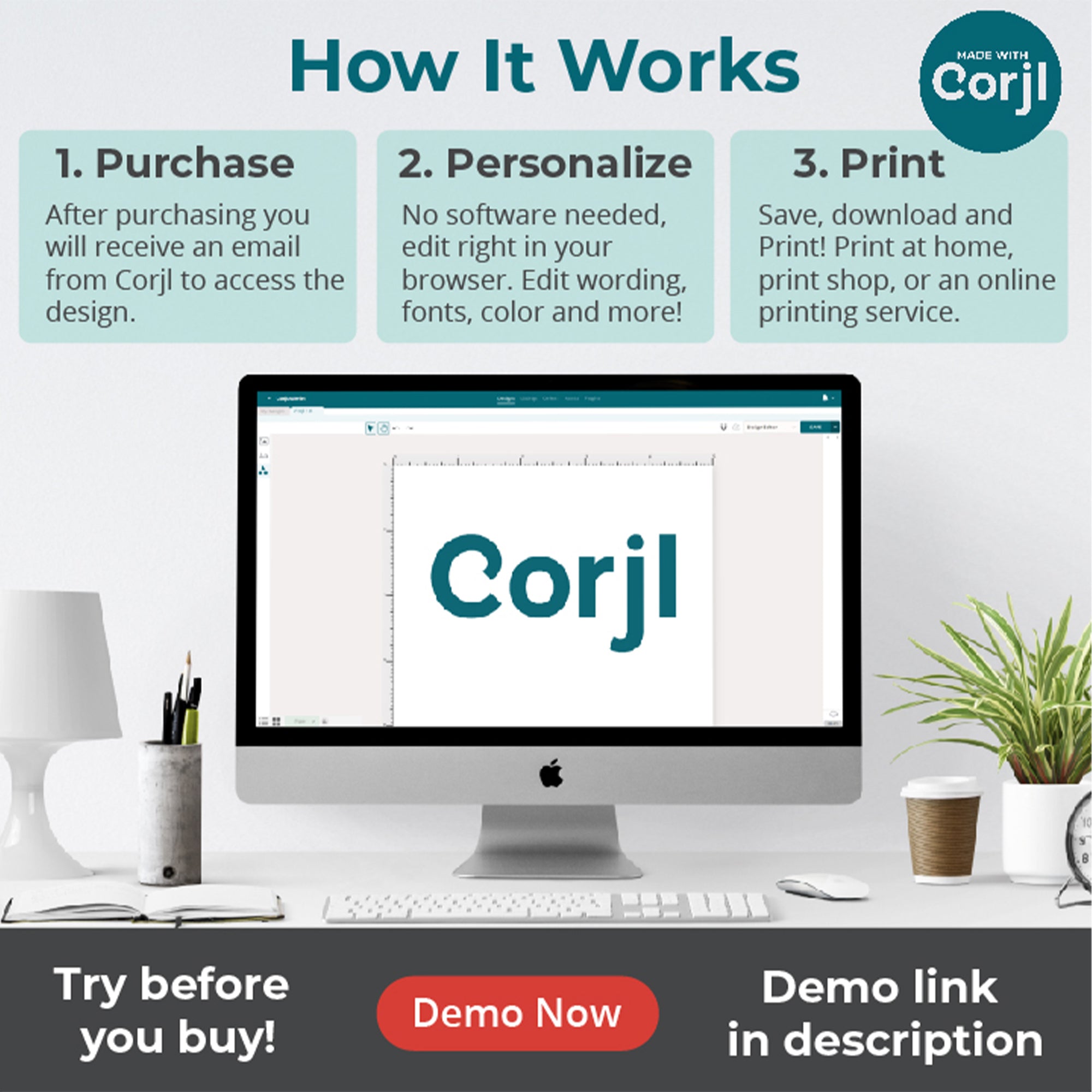 1. Edit text in Corjl, download & print yourself After purchase, you'll receive an email within minutes with access to your item. You can edit directly in your web browser using Corjl.com. No physical items will be mailed (Instant Download). |