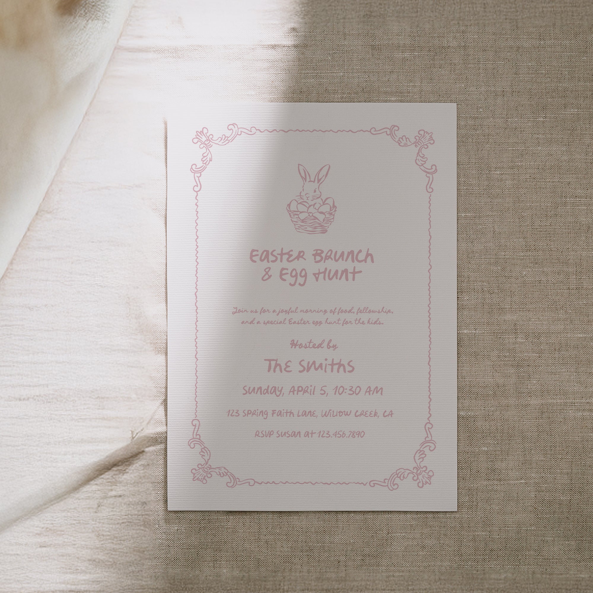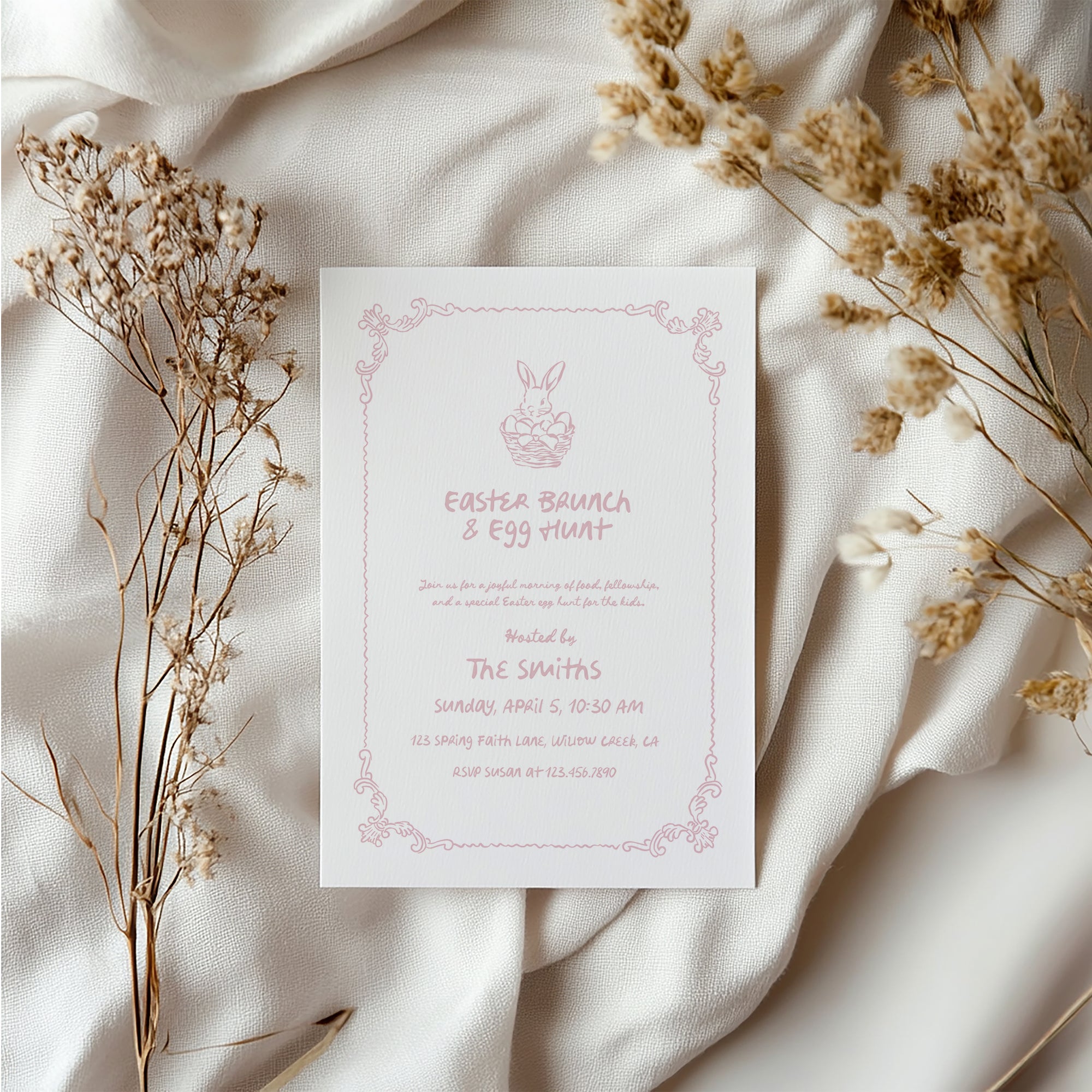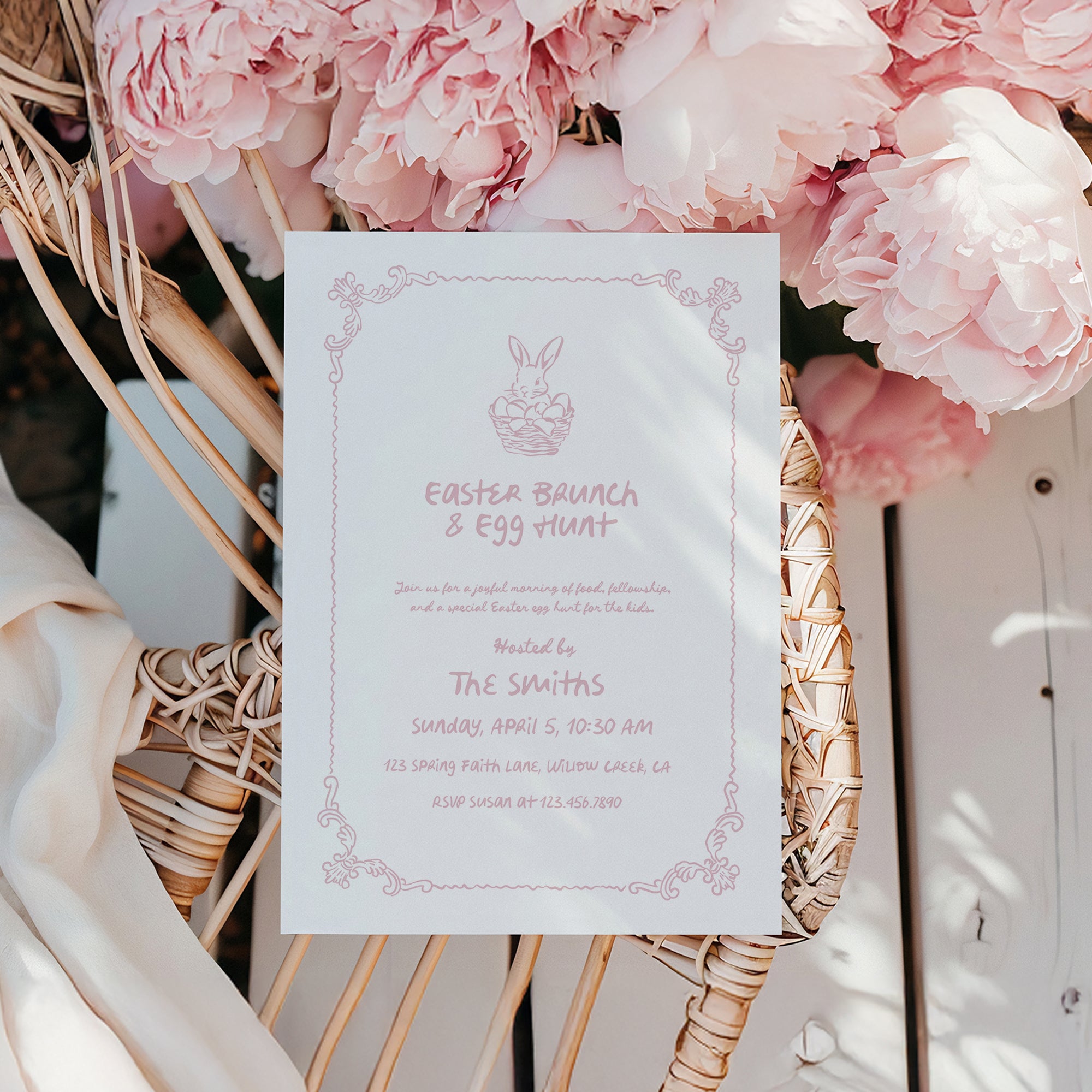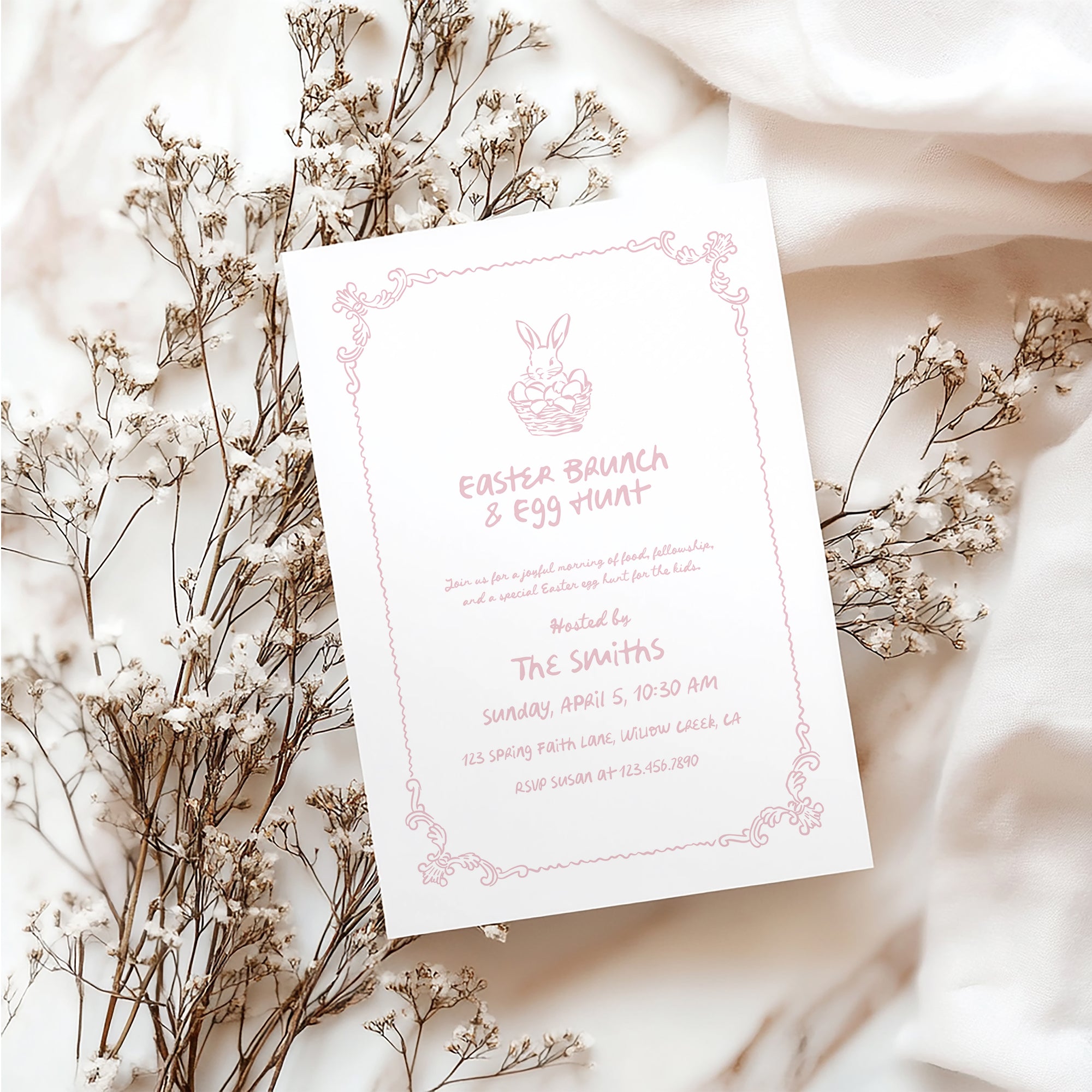 Hand drawn Easter brunch invitation with a sweet bunny illustration, perfect for a spring egg hunt with family or church groups.