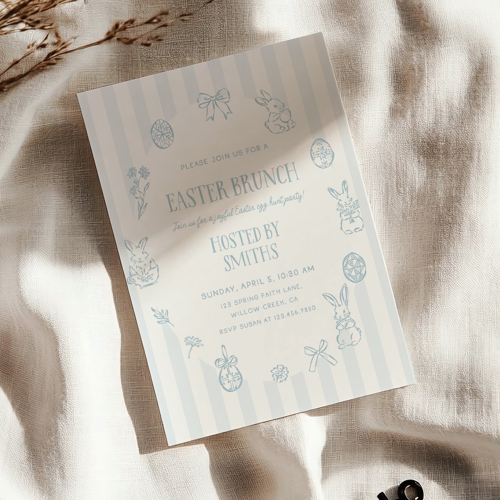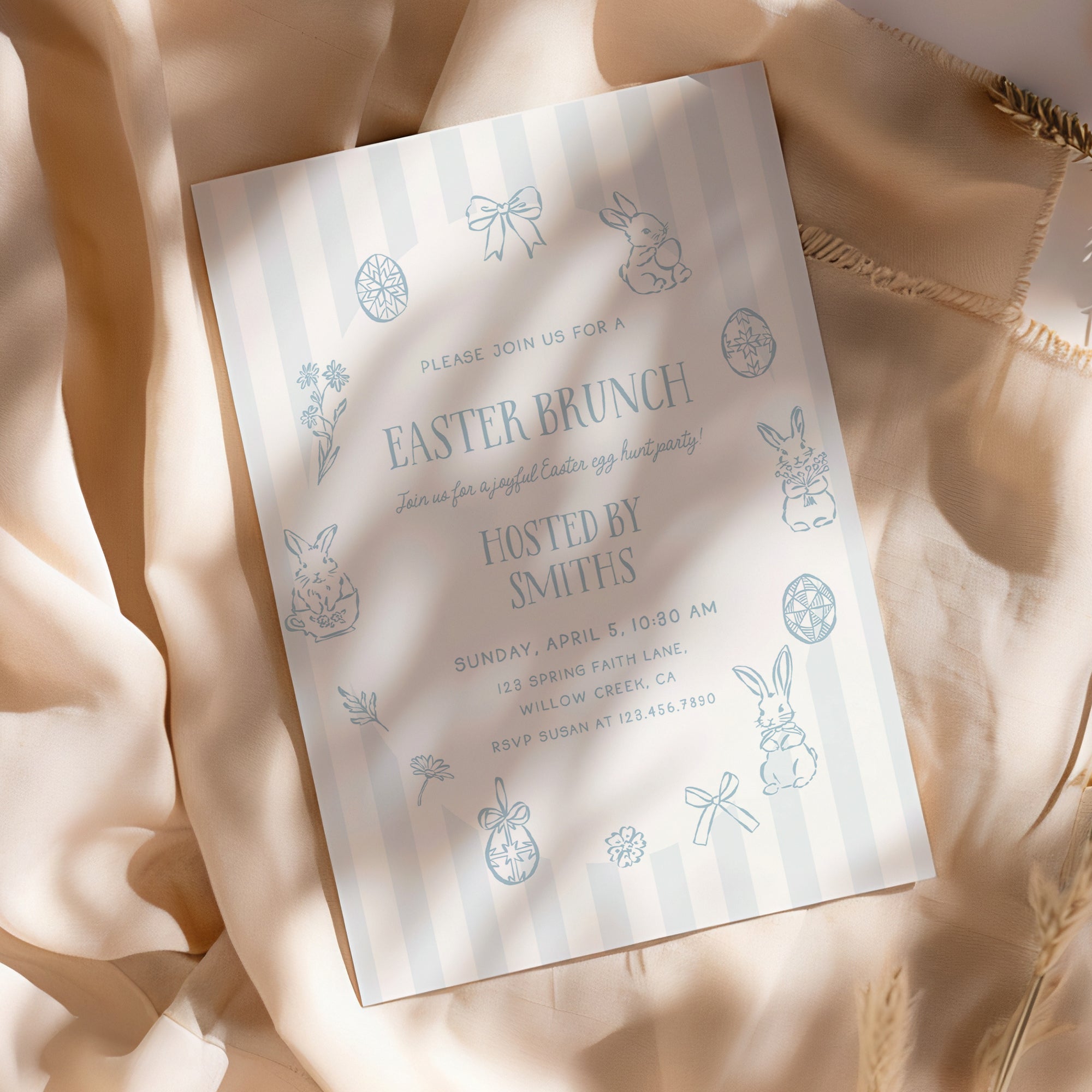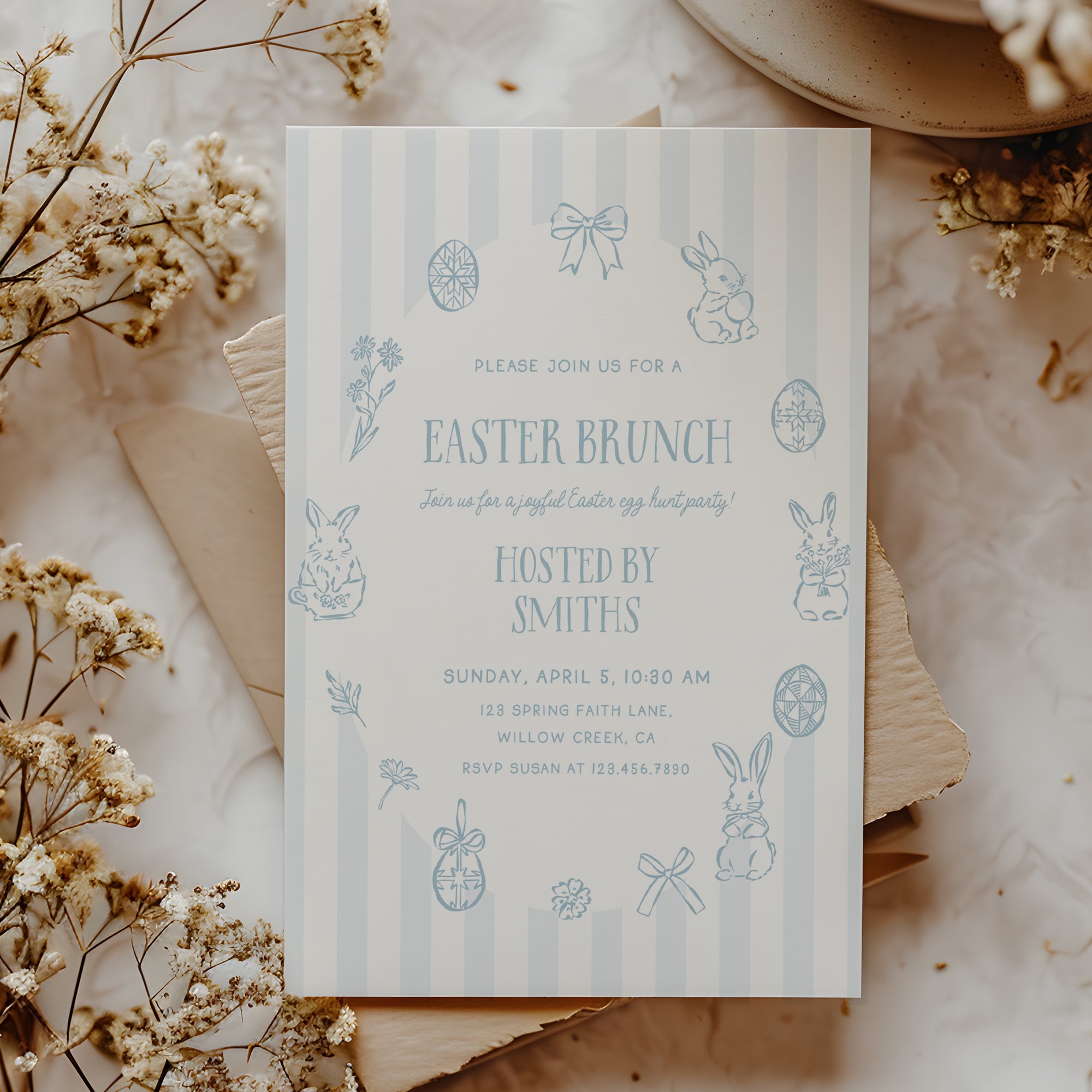 This soft blue, hand illustrated design is ideal for hosting a joyful Easter party for little ones, including an egg hunt and fun spring activities at home or with friends.
