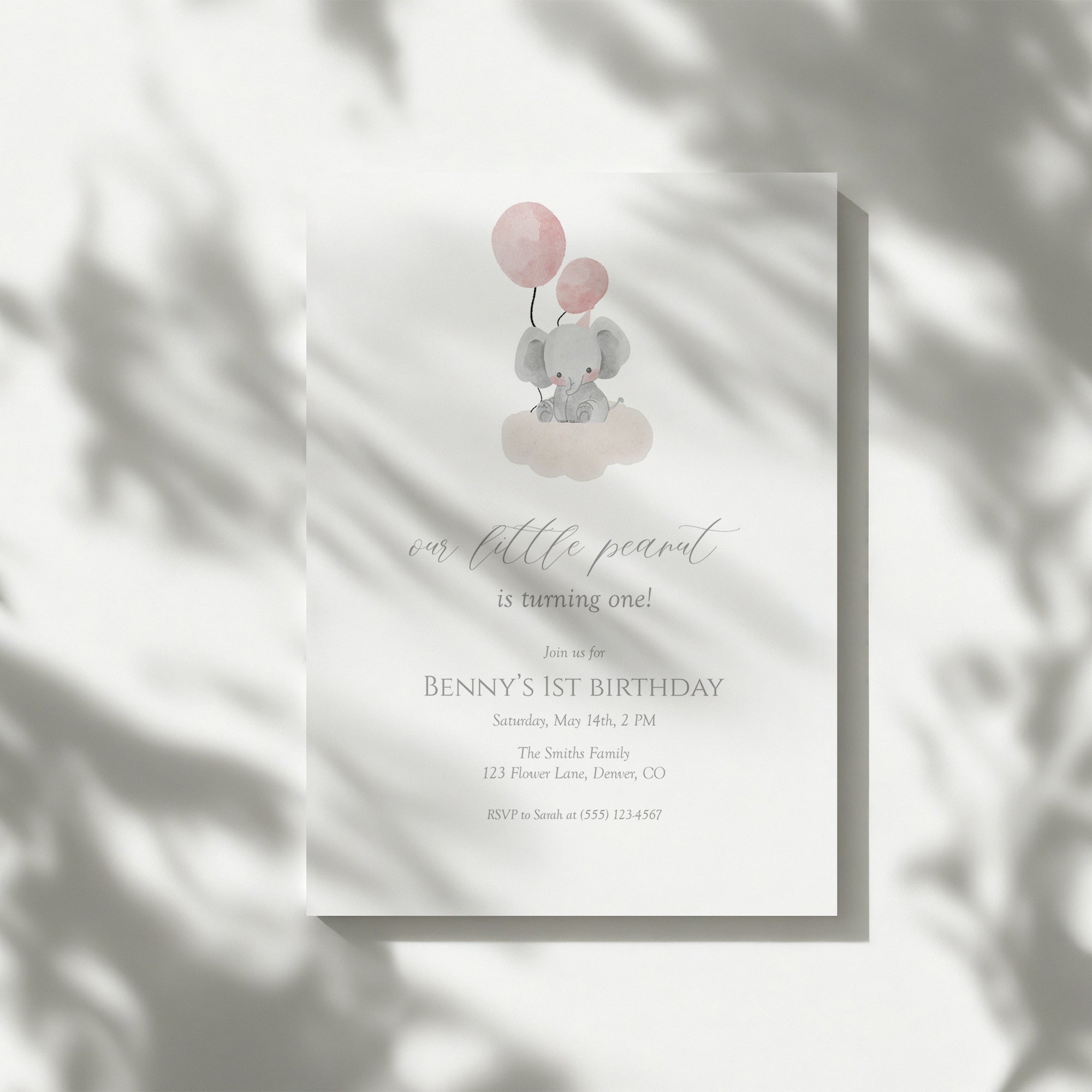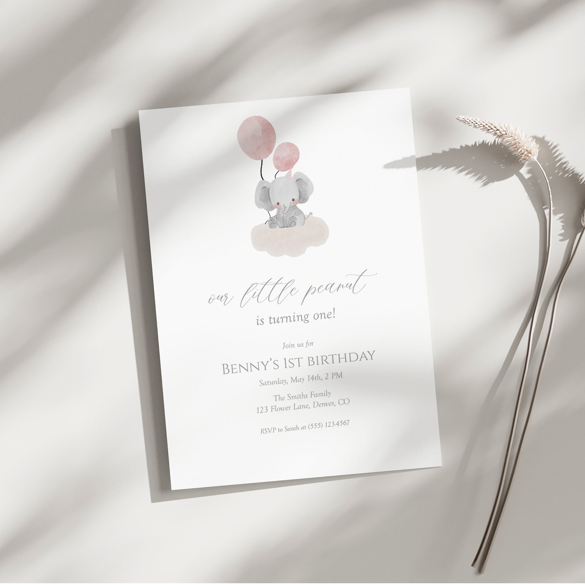Celebrate your little peanut's milestone with our adorable Pink Elephant 1st Birthday Invite! This cute and minimal design is perfect for your little girl's special day. Easily customize it with our editable template—just download, edit, and print! Ideal for a delightful birthday party, this digital download makes inviting family and friends a breeze. Capture the joy of turning one with this charming invite. Get ready for an unforgettable celebration!