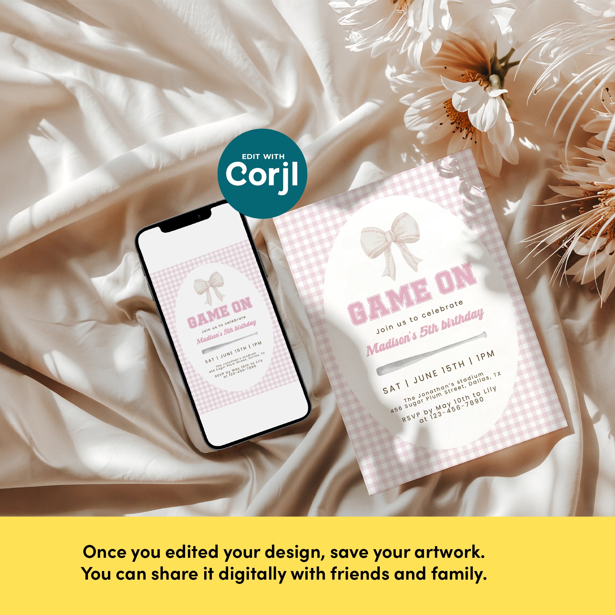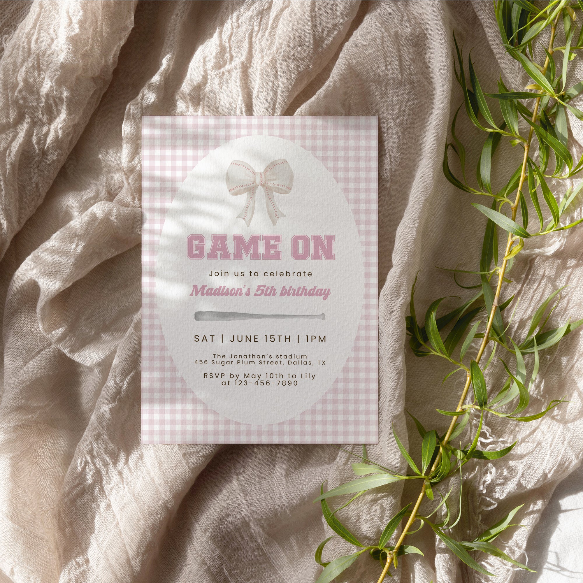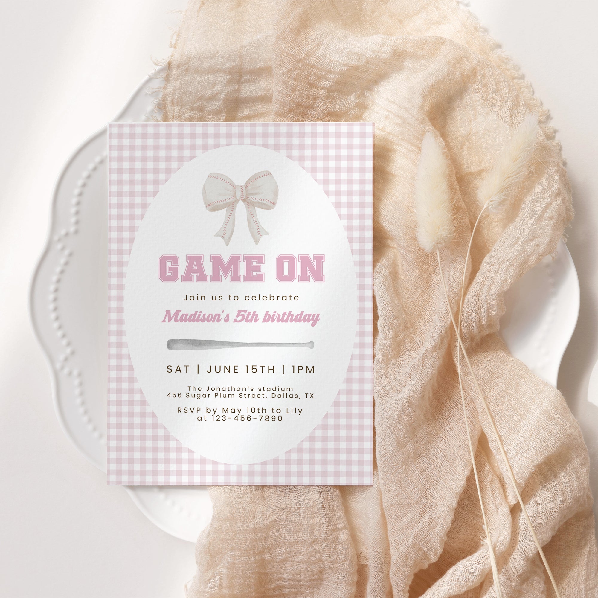 Pink baseball bow gingham pattern birthday invitation template for girls 0334