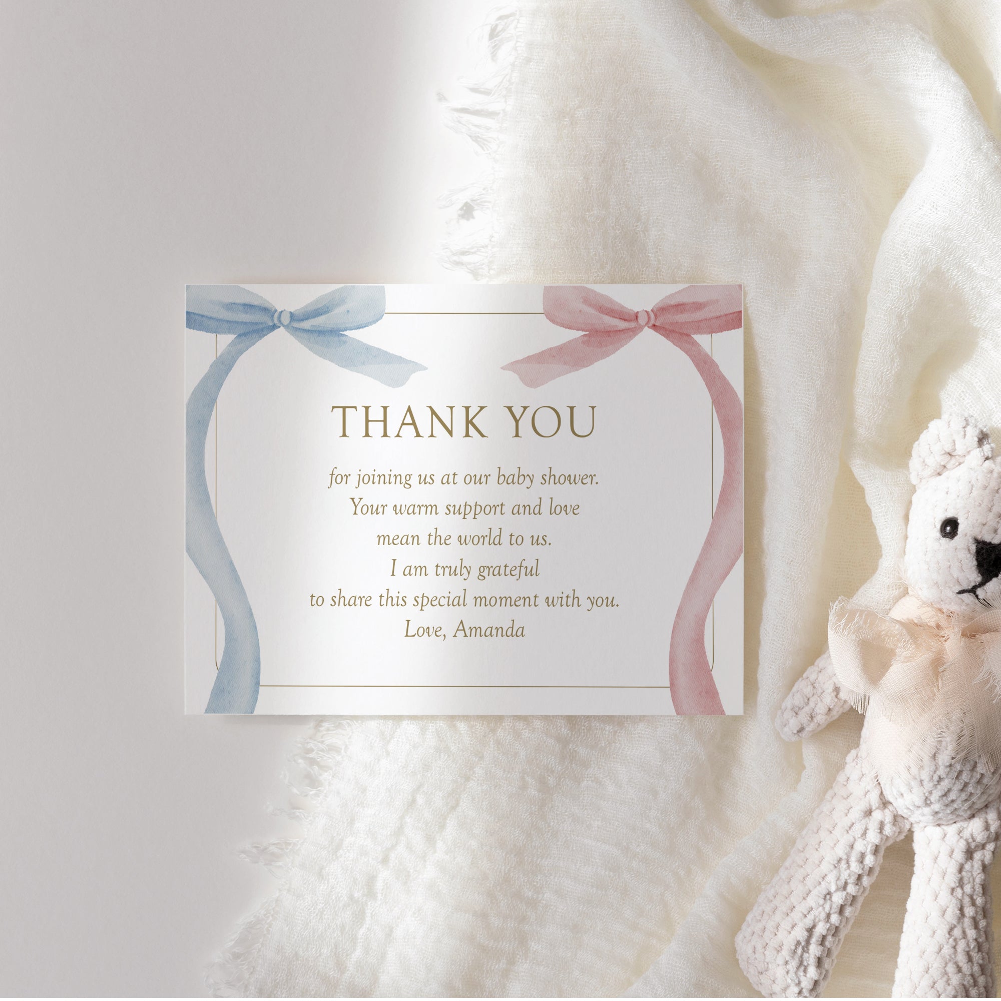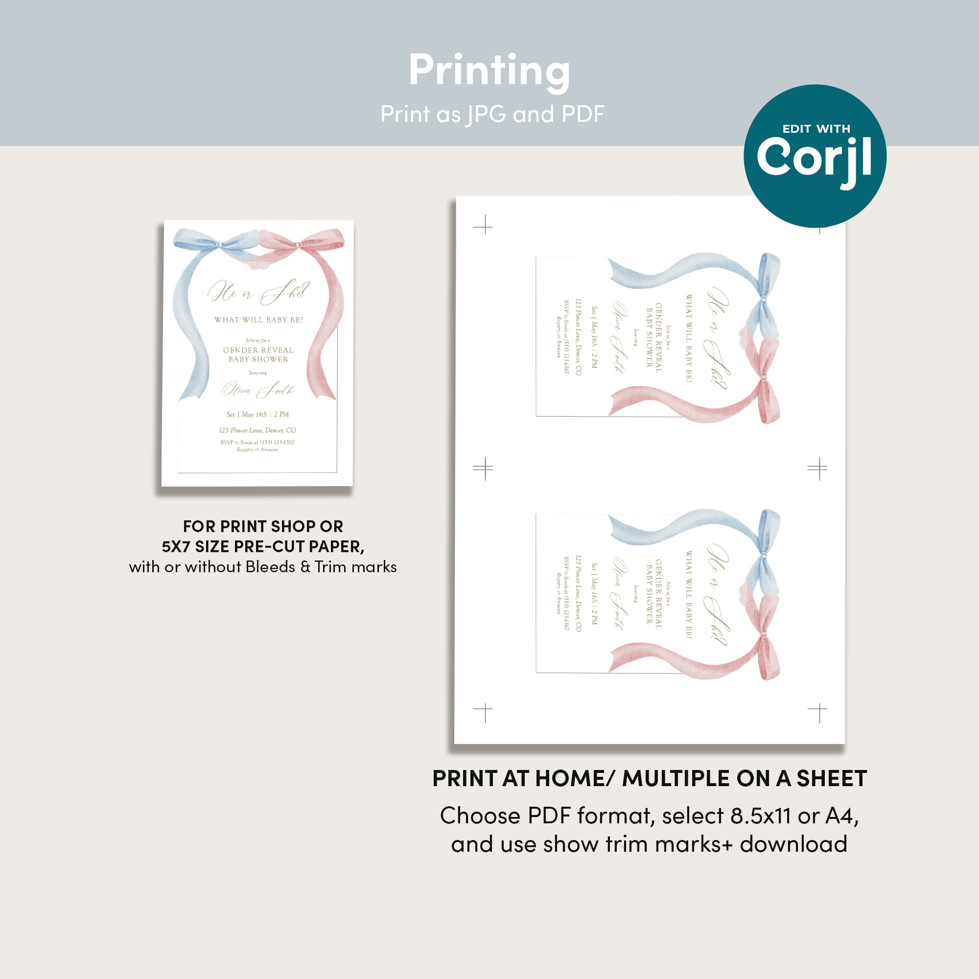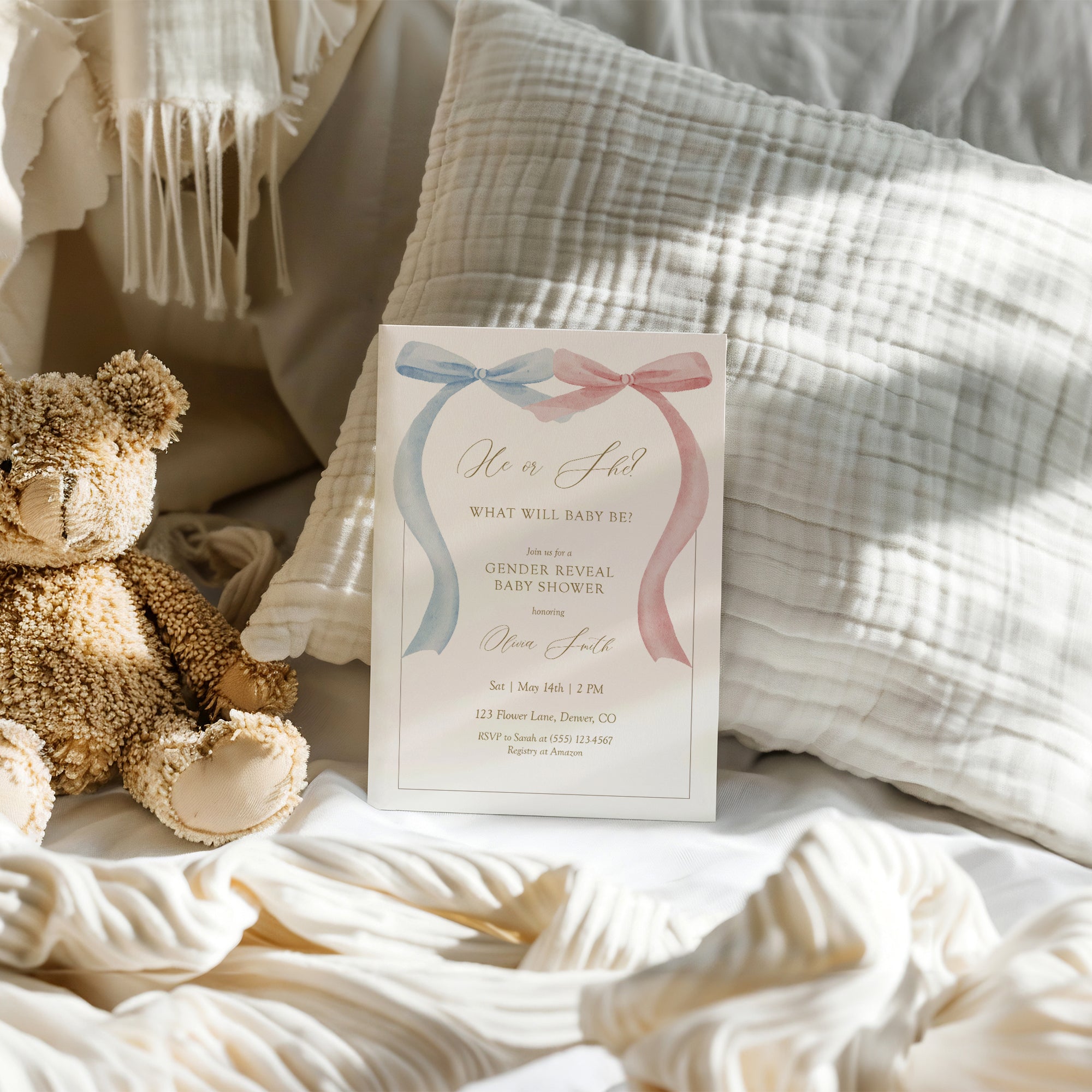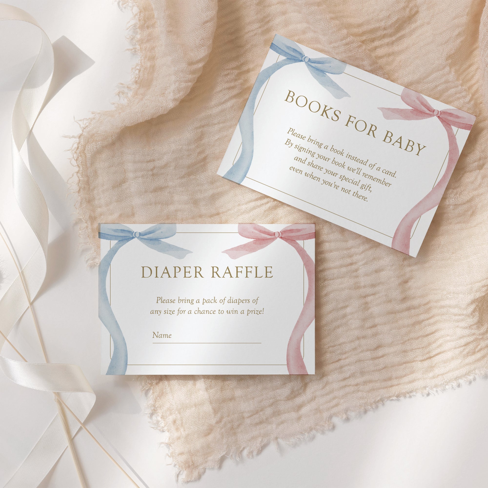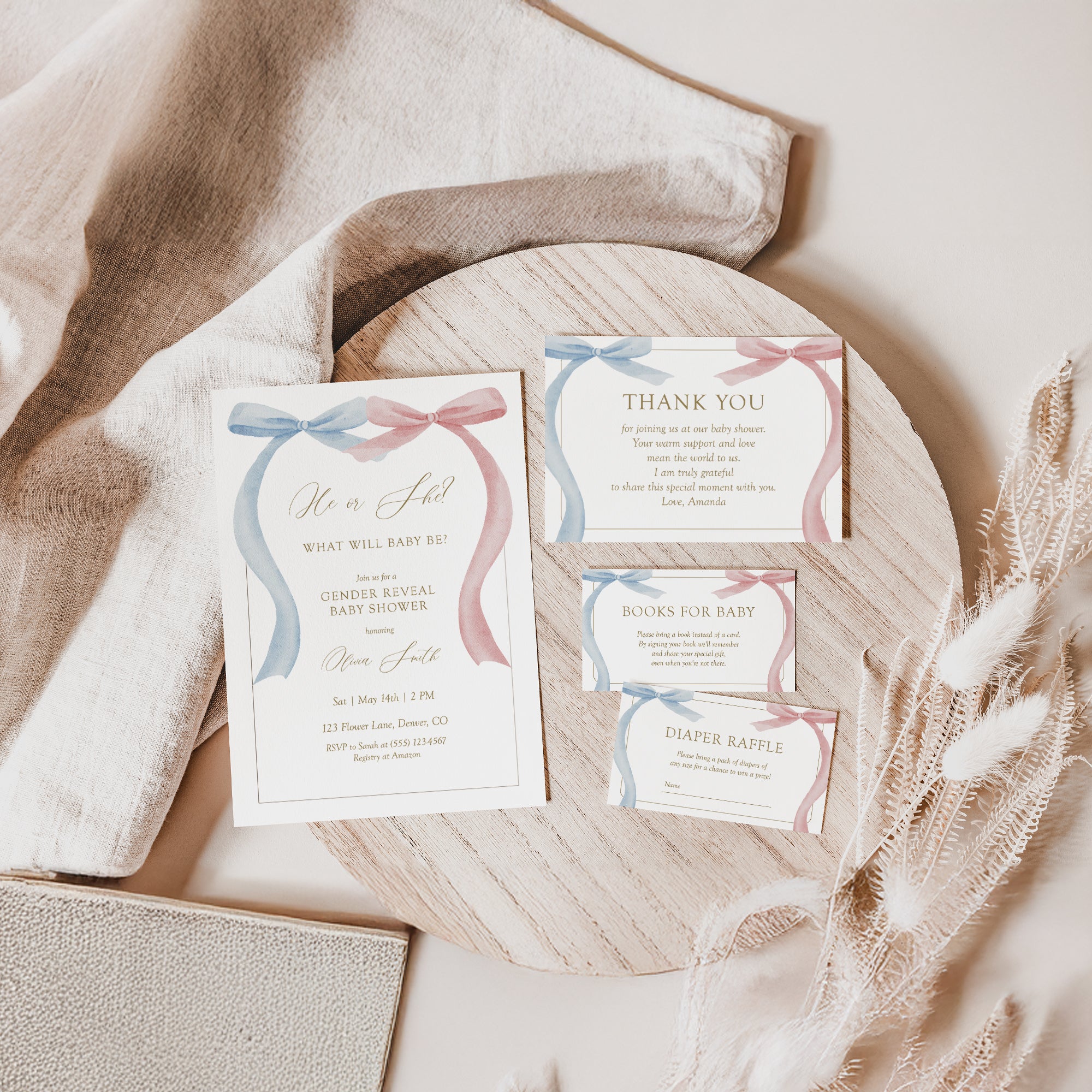 Celebrate your little one's arrival with our Pink Blue Bow Coquette Gender Reveal Baby Shower Invitation Template Bundle! This digital download includes beautifully designed invitations, perfect for sharing the excitement with friends and family. Also included are adorable Books for Baby cards, a fun baby raffle template, and charming thank you cards to express your gratitude. Easy to customize and print, this bundle is your go-to for a stylish and memorable gender reveal party!