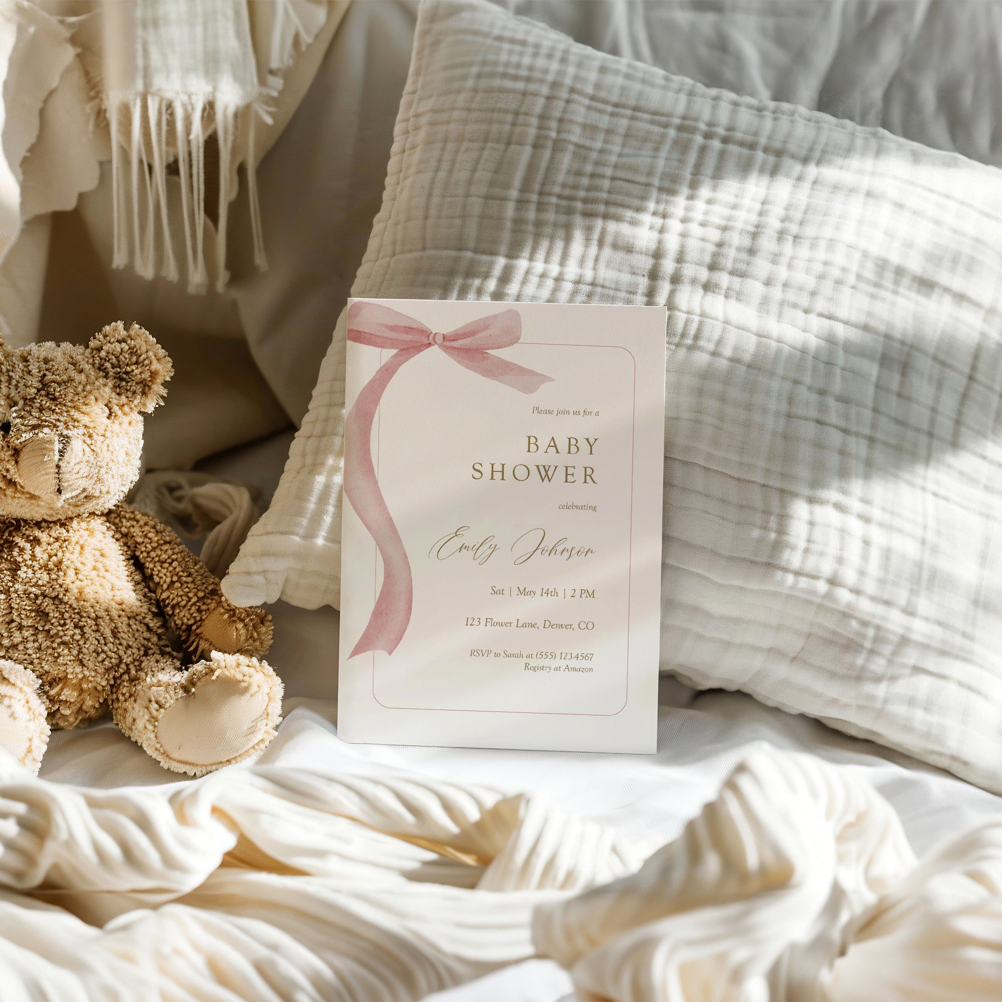 Celebrate your little one’s arrival with our delightful Pink Bow Coquette Baby Shower Invite Template Bundle! This digital download includes everything you need for a stylish celebration: invitation, thank you card, and baby raffle ticket templates. Perfect for creating memorable moments and capturing memories in books for baby, our elegant designs will impress your guests. Easy to customize, print at home or send digitally to suit your needs. Make your baby shower special with this charming bundle!