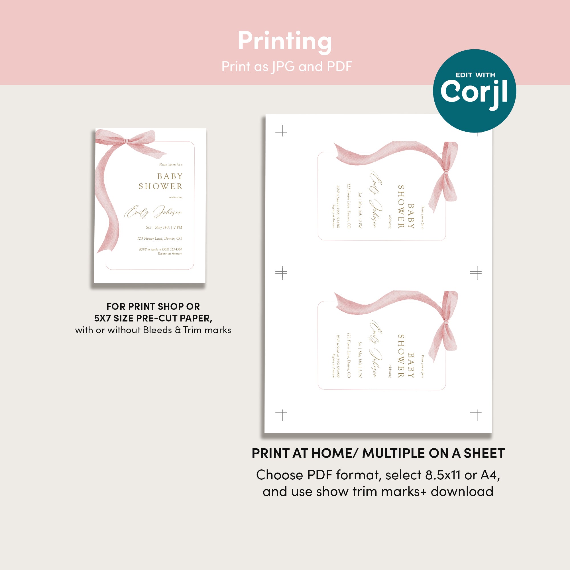 1. Edit text in Corjl, download & print yourself After purchase, you'll receive an email within minutes with access to your item. You can edit directly in your web browser using Corjl.com. No physical items will be mailed (Instant Download). |