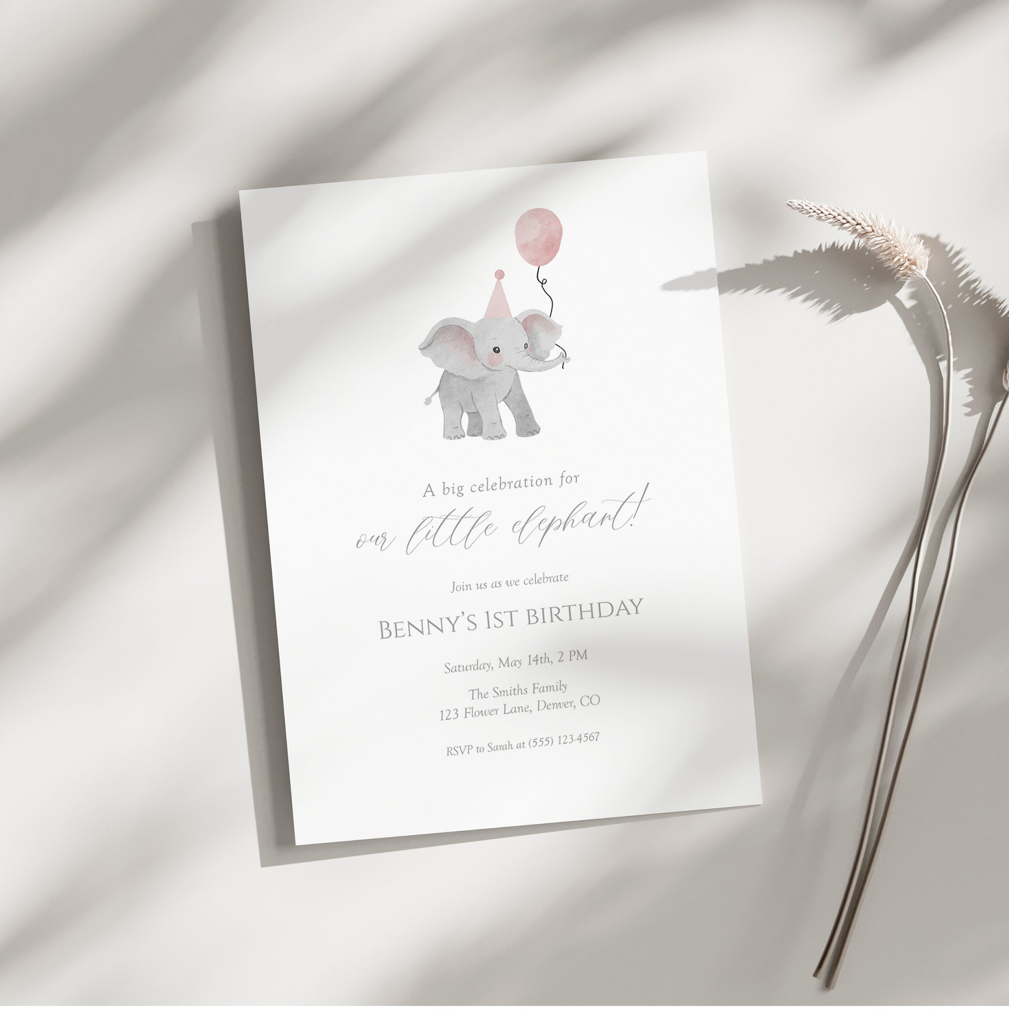 Pink Elephant Girl 1st Birthday Invite, Editable Digital Download Template 0324