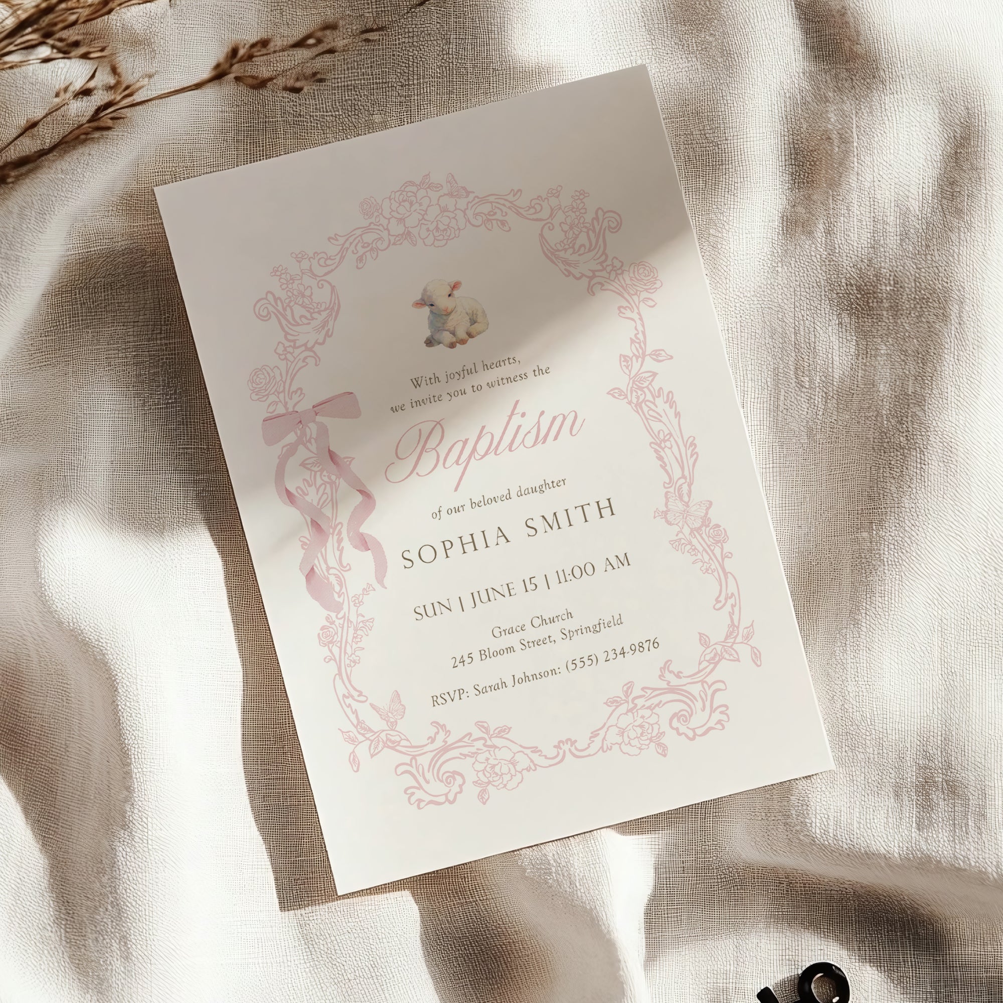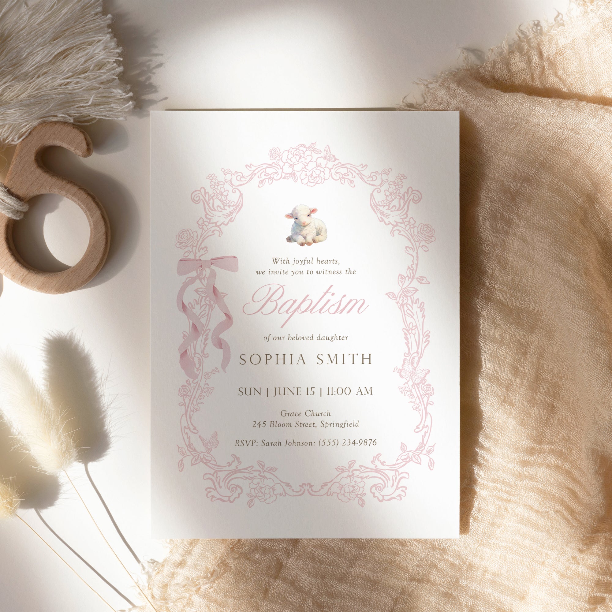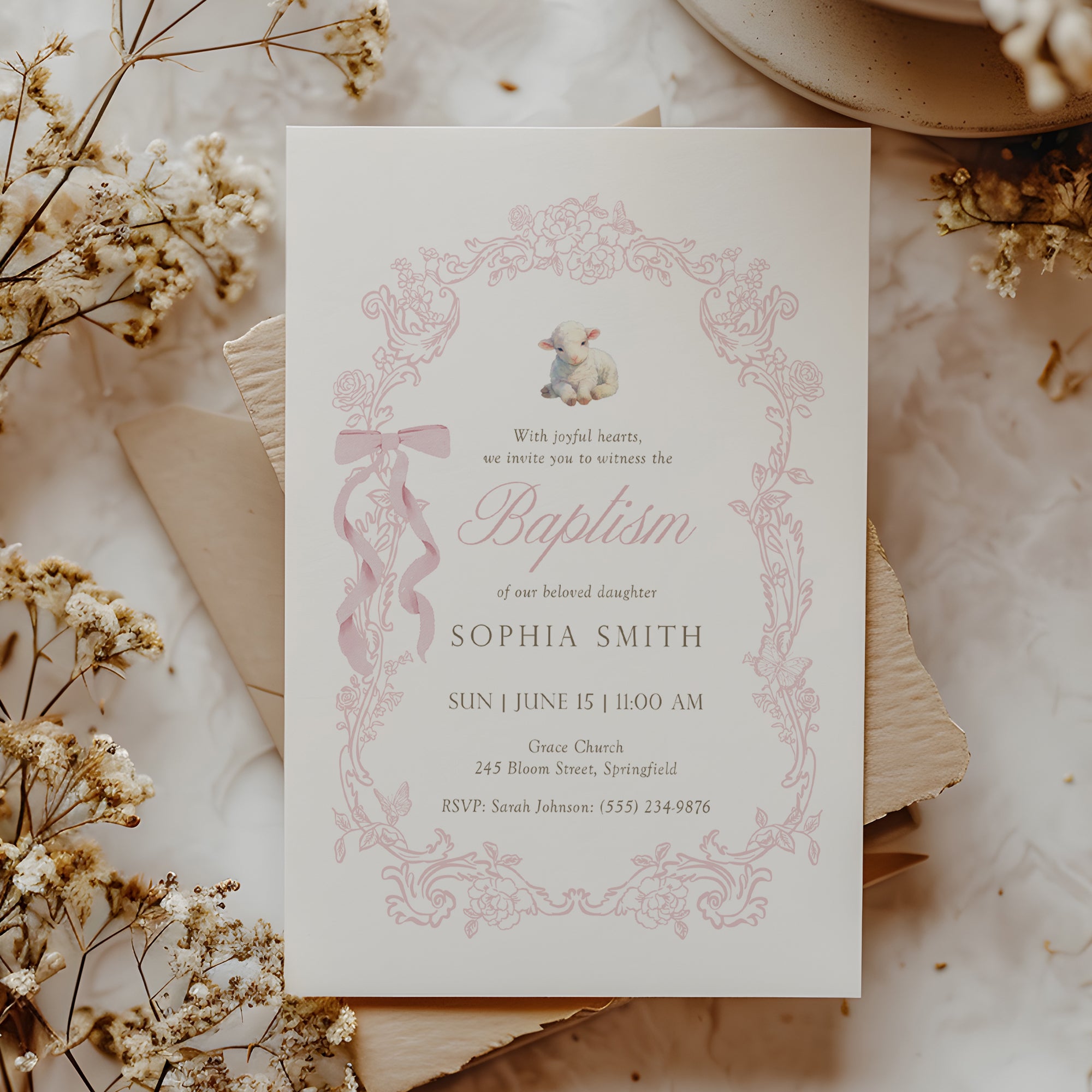 Pink Lamb Baptism Invitation Template, Floral Christian Girl Baptism Invite 0502