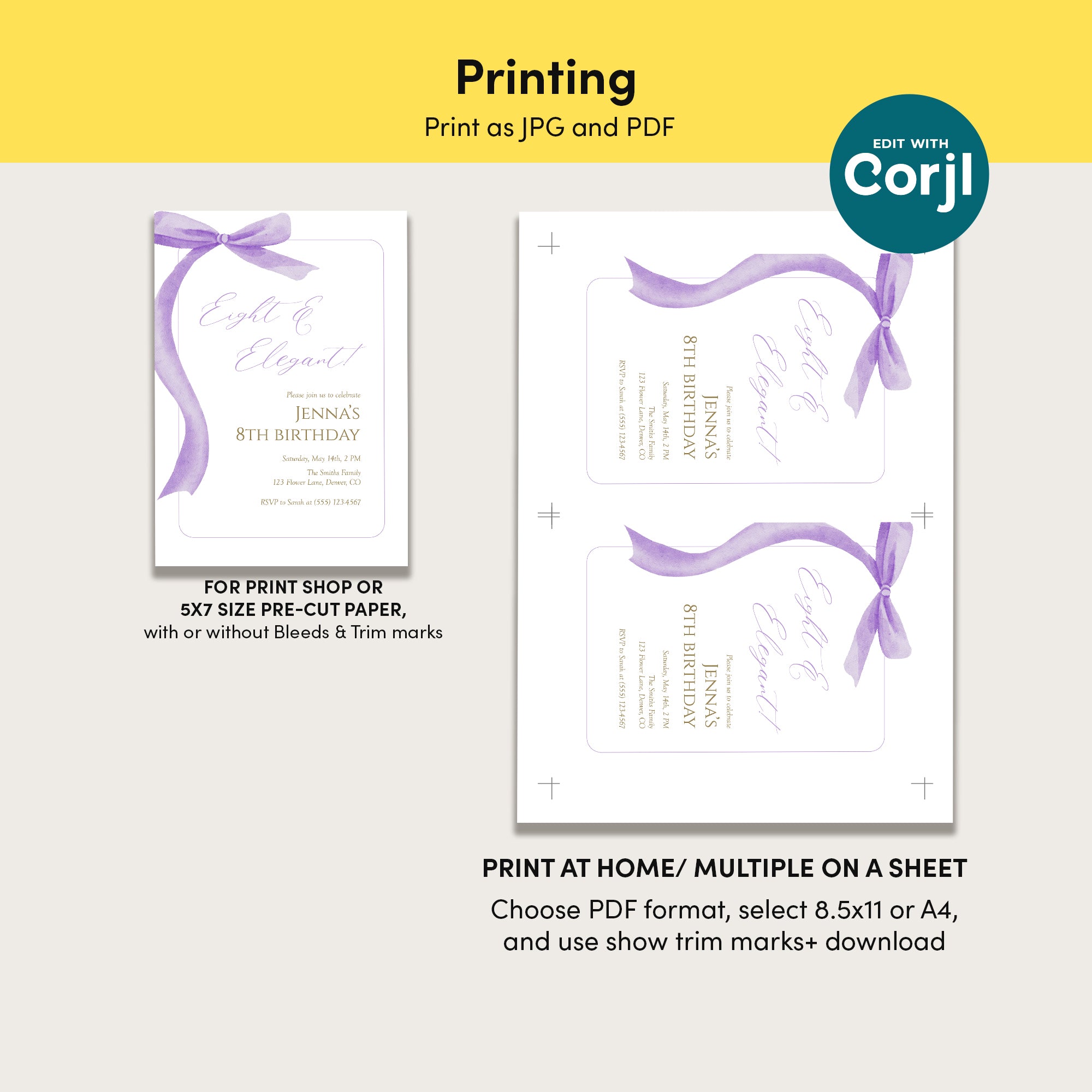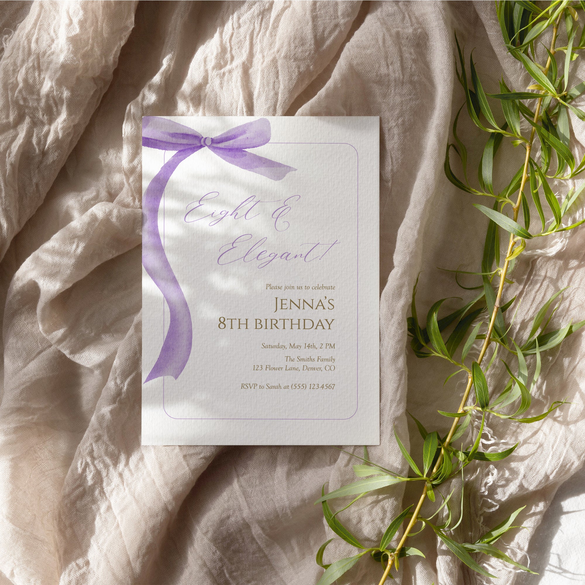 Celebrate your little one's special day with our elegant invite for an 8th birthday girl! This stunning eight and elegant invitation features a chic purple bow design. Perfect for modern celebrations, this editable template allows you to personalize the details with ease. Instantly download and print your invitations at home or share digitally with friends and family. Make her birthday unforgettable with a touch of sophistication!