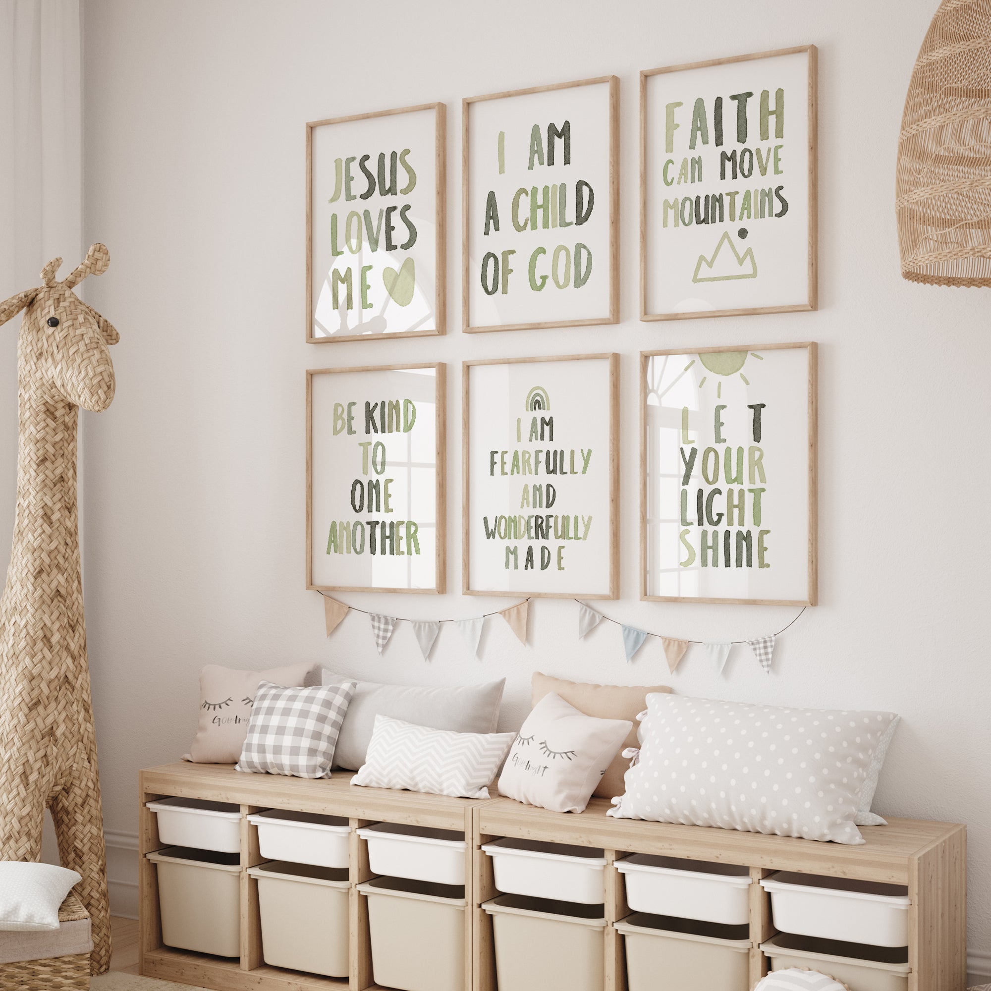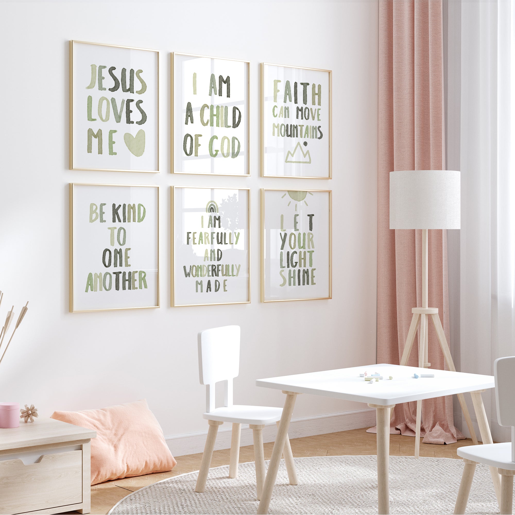 set of 6 sage green let your shine Christian kids bible verse art print 07-123