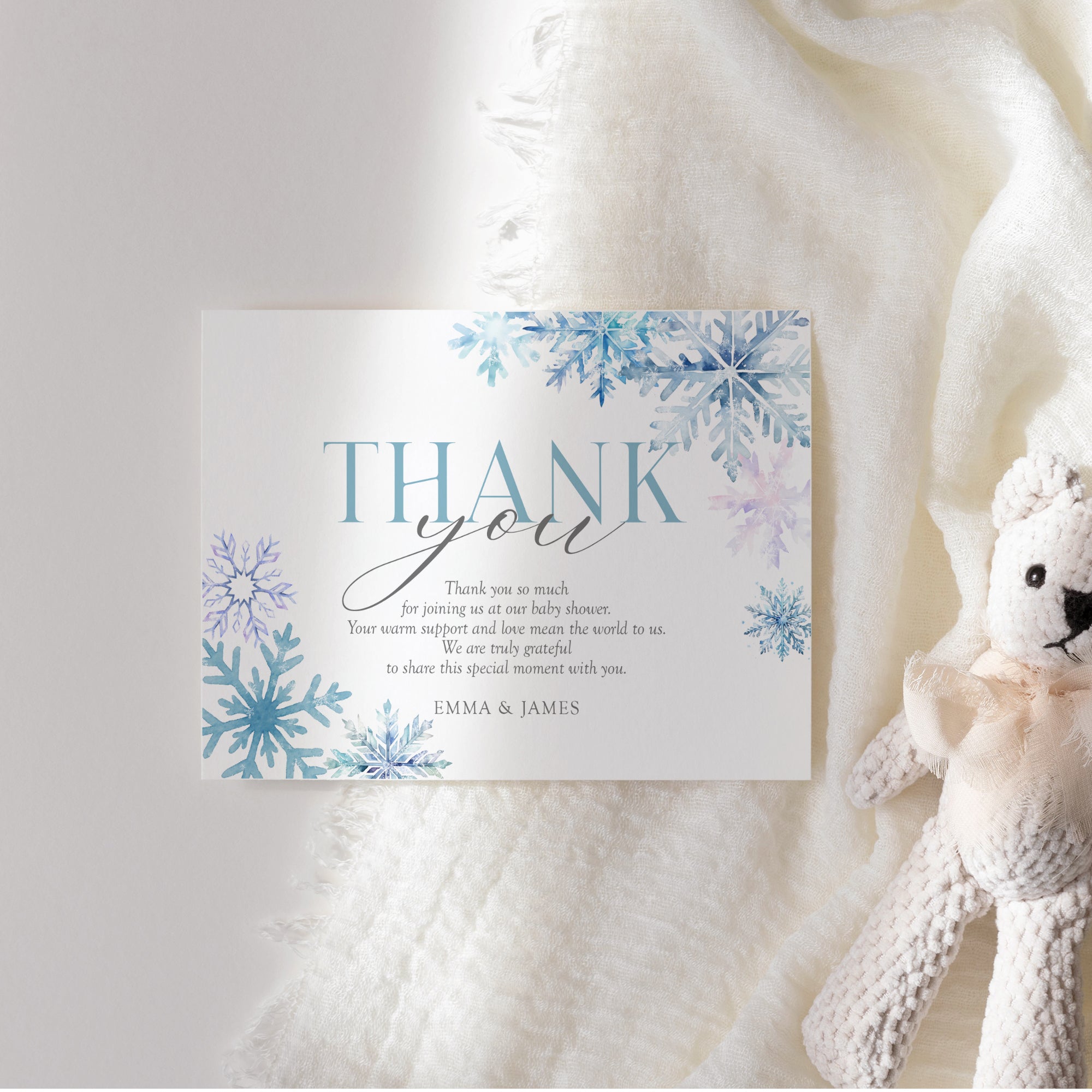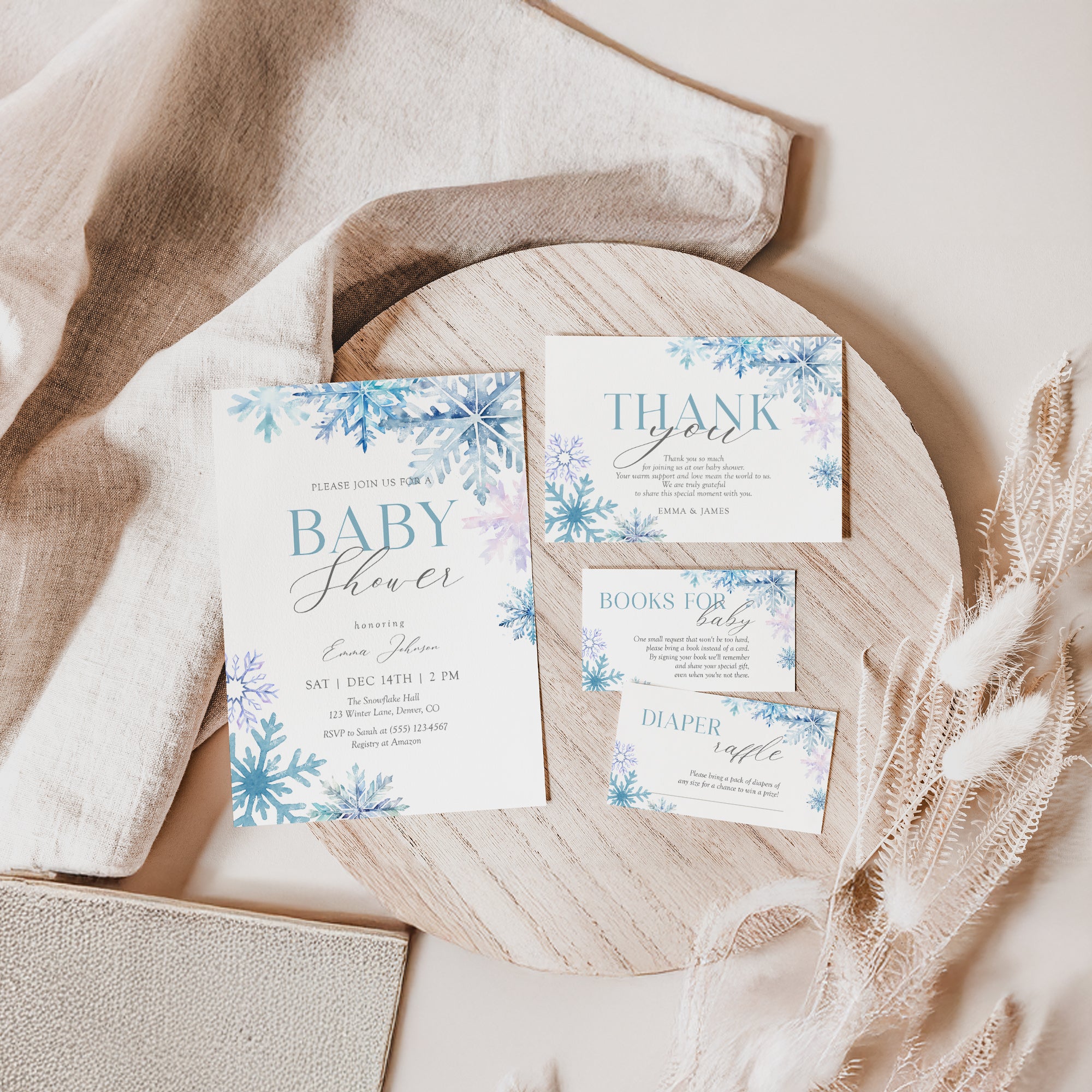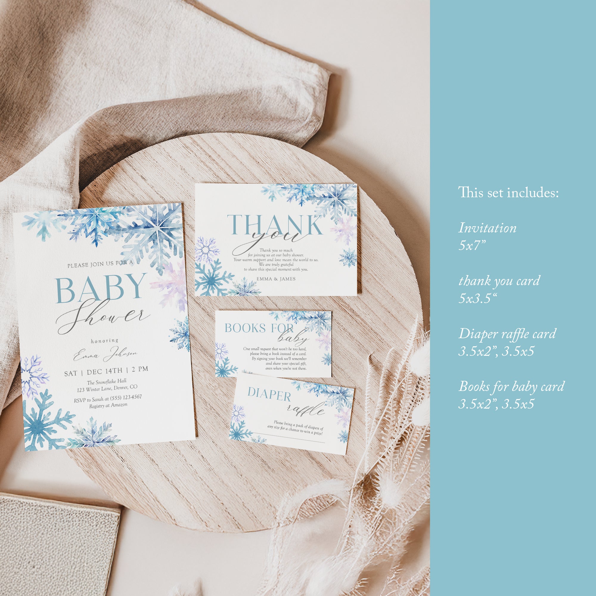 Celebrate your winter baby shower with this elegant Snowflake Winter Baby Shower Invitation Set. Featuring delicate watercolor snowflakes in soft blues and purples, this printable bundle includes an invitation, thank you card, books for baby card, and diaper raffle card. Ideal for a snowy, holiday, or Christmas-themed shower, this coordinated set ensures a seamless and stylish celebration. Easily personalized and printed, it adds a refined touch to your special event while keeping planning effortless. Perfect for welcoming your little one amidst the magic of the season.