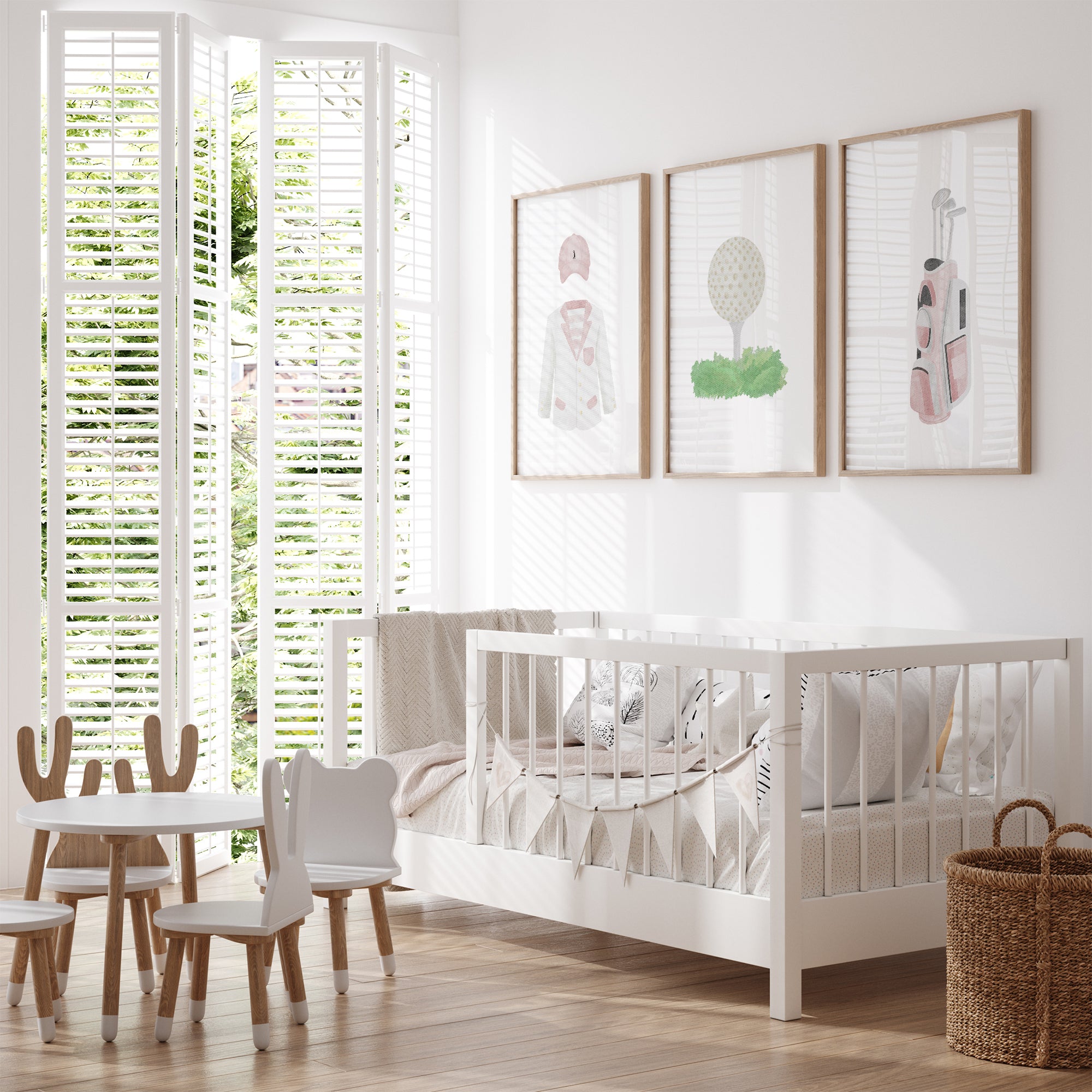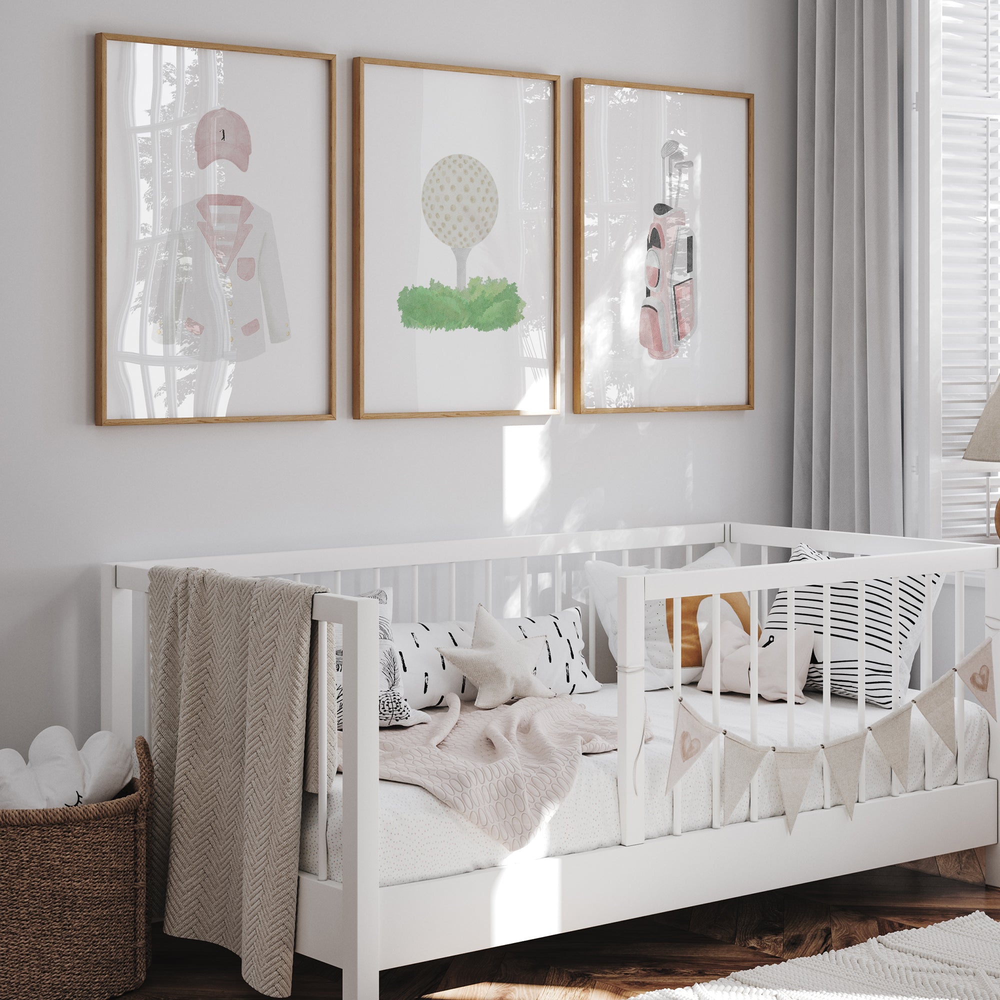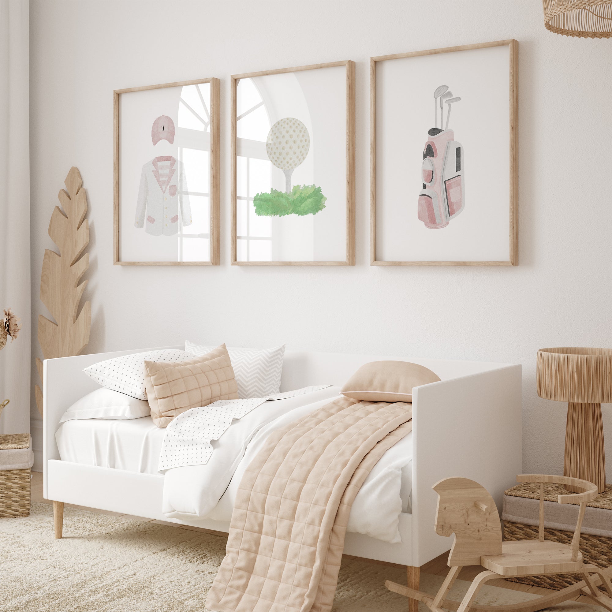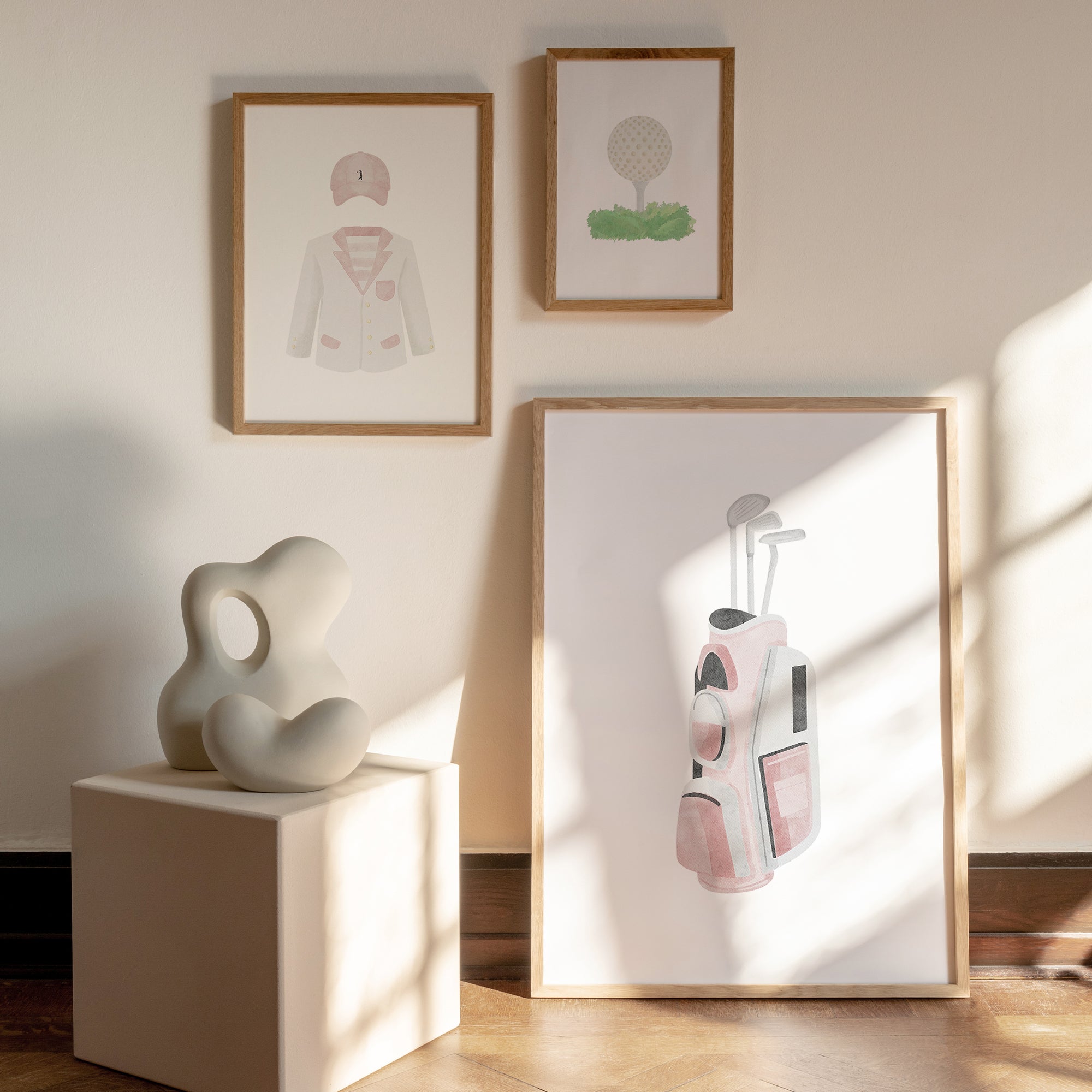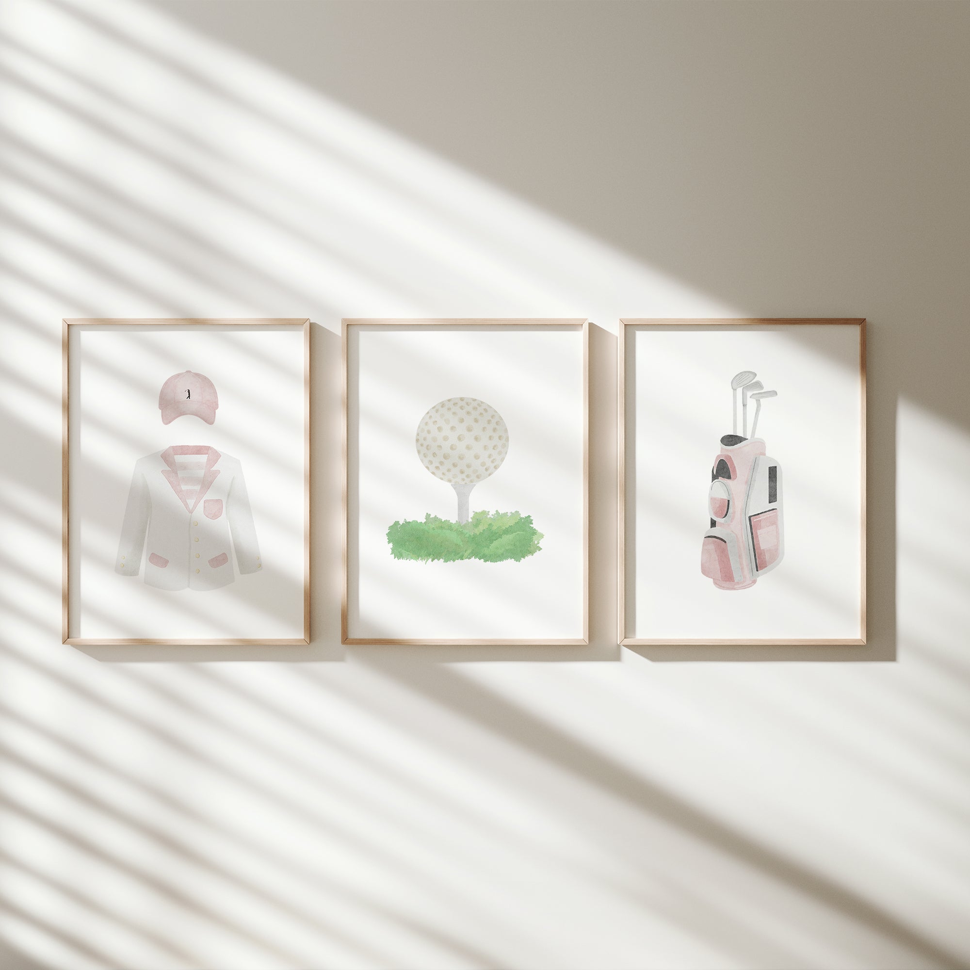 Watercolor pink golf jacket, golf ball tee, and golf club set of 3 wall art prints 07-27111